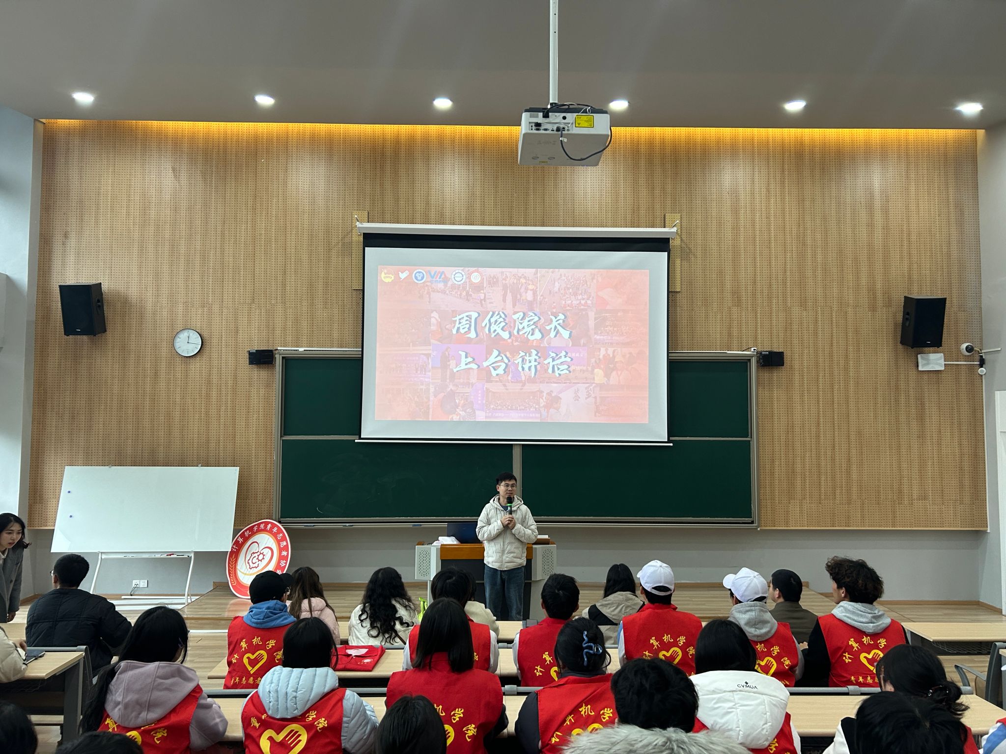 首先全体师生观看青年志愿者宣传视频——《志愿的答案》。接着由我院学工副院长周俊进行动员演讲,周俊院长分享自身志愿服务经历,深化了同学们对奉献、友爱、互助精神的价值认同,激发同学们主动服务社会的责任感。之后由志愿者代表李小锋分享他的志愿经历和感受。李小锋同学的分享情真意切,从他的话语中,我们感受到了志愿服务的魅力和意义,使得大家深受鼓舞。