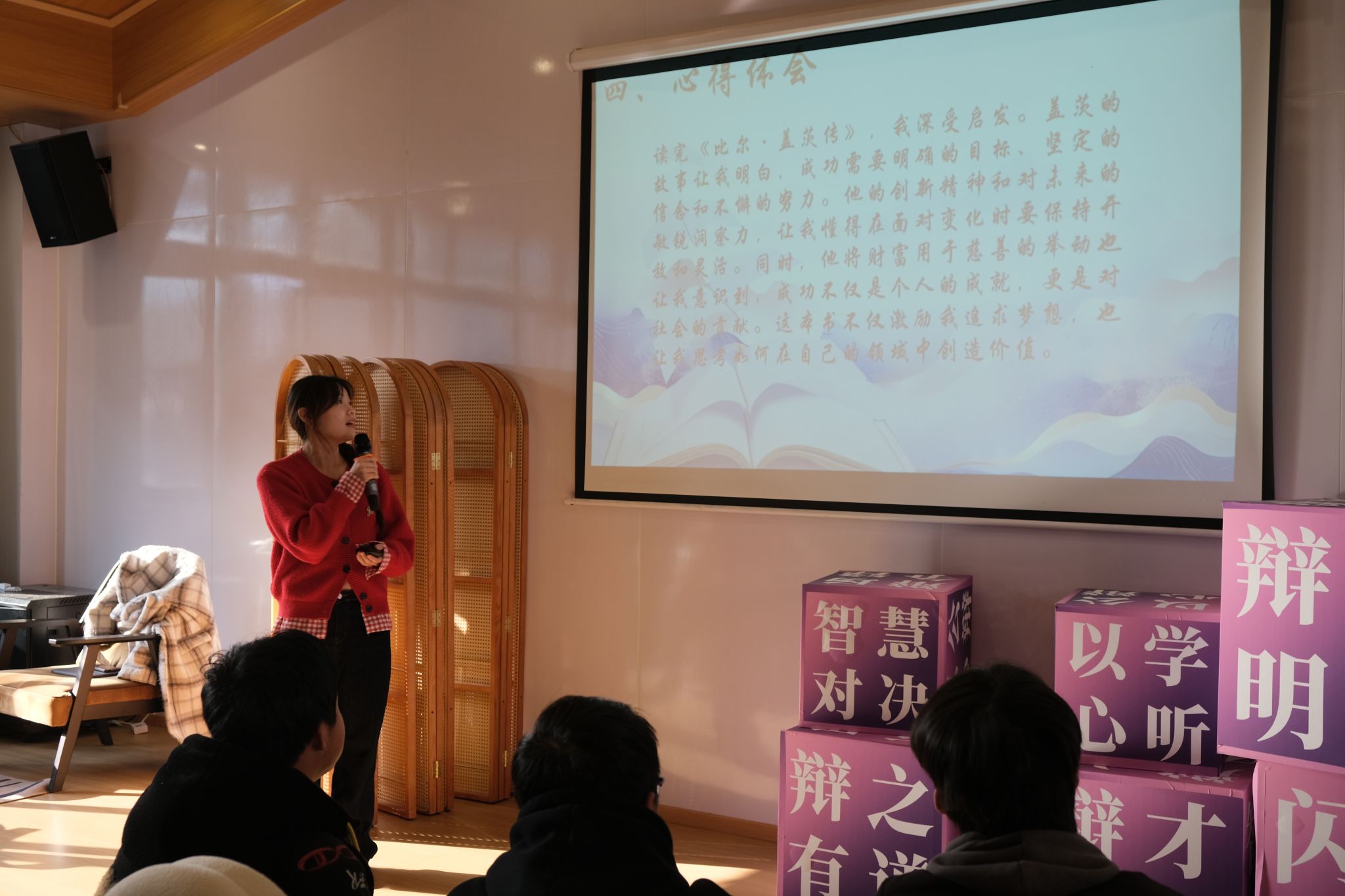 张鑫淼老师在活动中表示:“这次分享会不仅是一次阅读交流活动,更是一次思想的碰撞。通过分享大咖的故事,同学们可以从中汲取智慧,找到自己的榜样,为未来的学习和生活提供指引。”此次活动的成功举办,为同学们提供了一个展示自我、交流思想的平台,激发了大家对不同领域知识的兴趣和探索欲望。通过分享《比尔·盖茨传》《一生的旅程》和《巴菲特传》,同学们对企业的创新精神、投资哲学以及个人成长等方面有了更深刻的理解。活动最后,同学们纷纷表示,未来将继续积极参与此类活动,不断提升自己的综合素质,为未来的职业发展和个人成长打下坚实的基础。