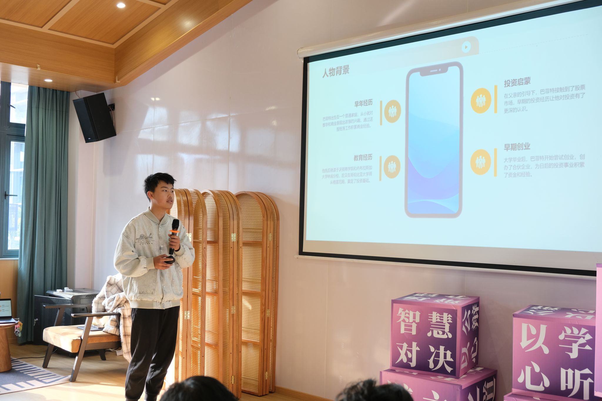 马子瑜同学则分享了《巴菲特传》。他深入剖析了巴菲特的投资哲学与人生智慧,指出巴菲特从小便展现出对数字的敏感和经商的才能,其独特的价值投资理念贯穿了他的一生。马子瑜强调,巴菲特坚持长期投资,注重企业的内在价值,这种投资策略使他在复杂的市场环境中获得了持续稳定的回报。他还分享了巴菲特的生活哲学,包括他的专注、耐心以及对工作的热爱。马子瑜表示:“巴菲特的故事让我明白,无论是投资还是学习,都需要保持专注和耐心,才能在未来的道路上走得更远。”