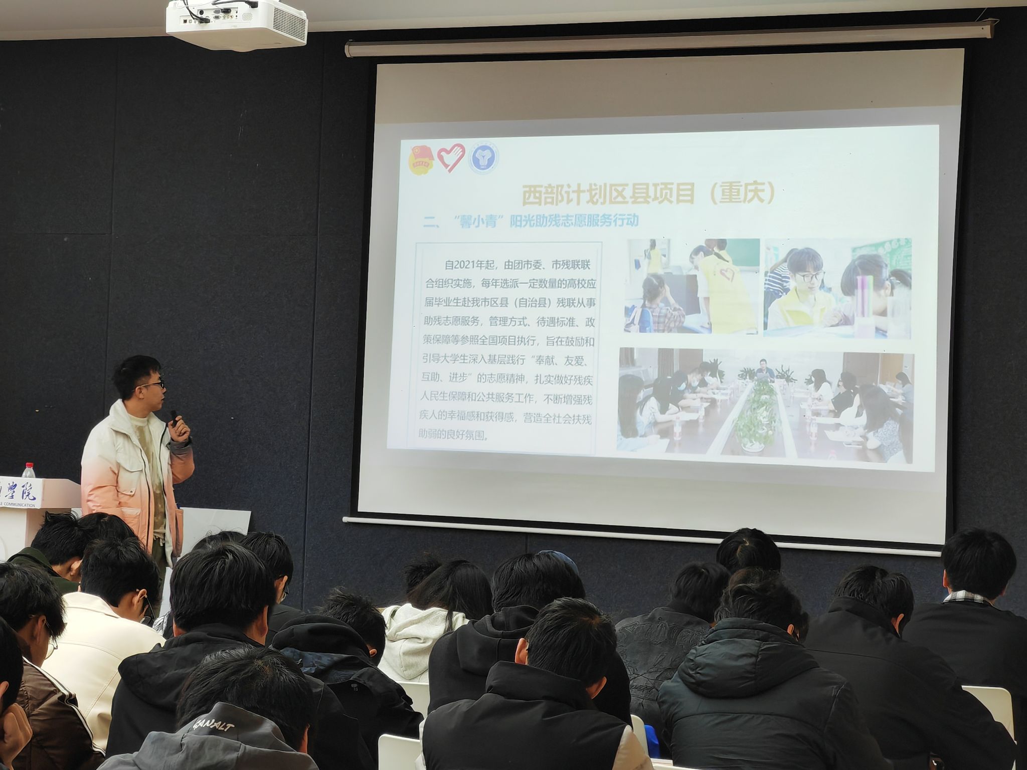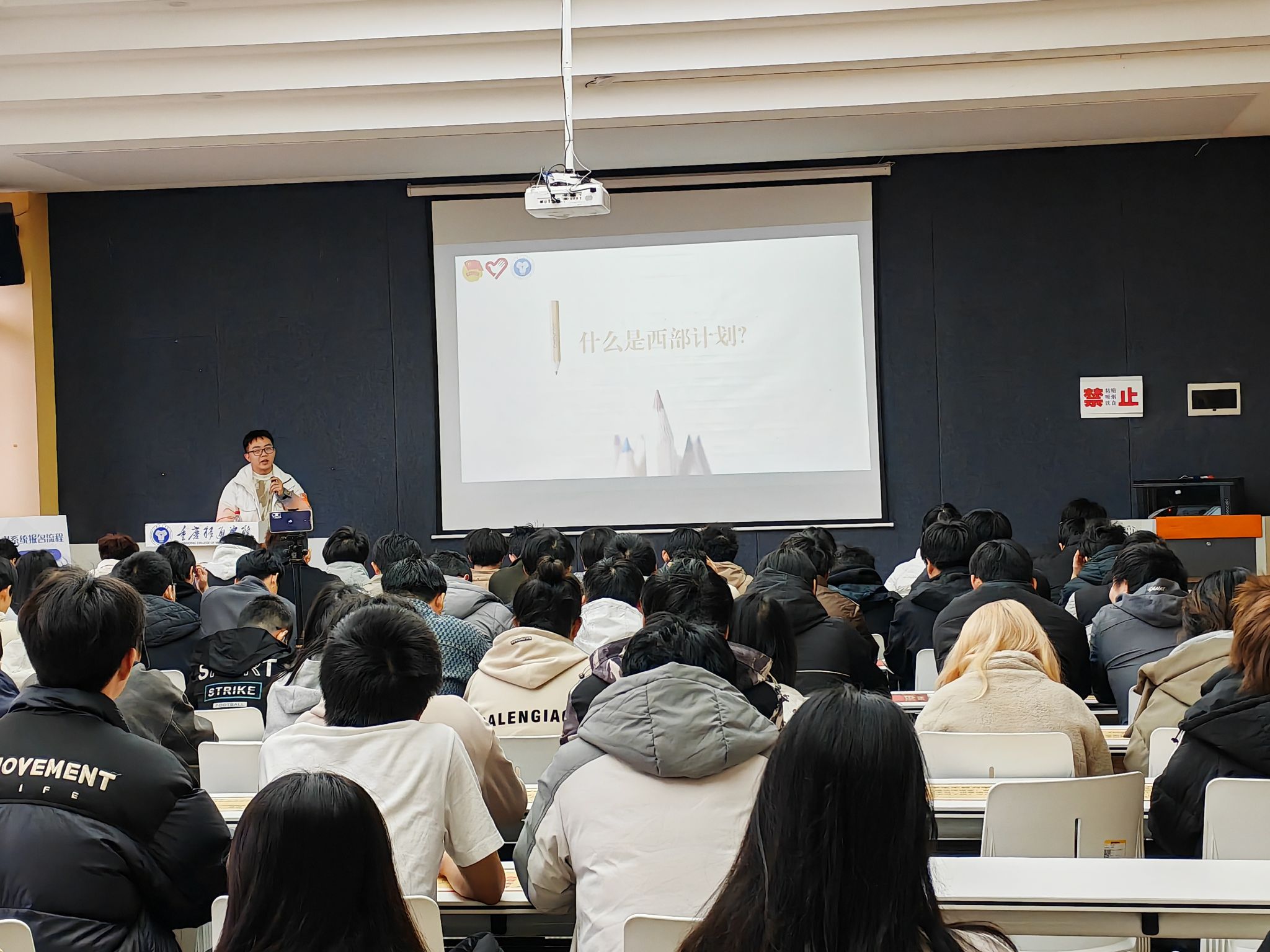 朱喆结合图文资料,进一步阐释西部计划在重庆地区的落地模式。自2003年起,重庆多个区县结合本地需求,推出与全国计划衔接的地方项目,为志愿者提供多元服务岗位。他概括性说明政策的核心优势:“无论是岗位分配还是资源支持,西部计划都致力于让青年在基层‘下得去、留得住、干得好’。”通过简要案例,他展示了志愿者如何利用技术助力乡村数字化建设,例如优化政务流程、搭建教育资源共享平台等。现场学子专注记录政策要点,不少同学对参与条件与申请流程表现出浓厚兴趣。