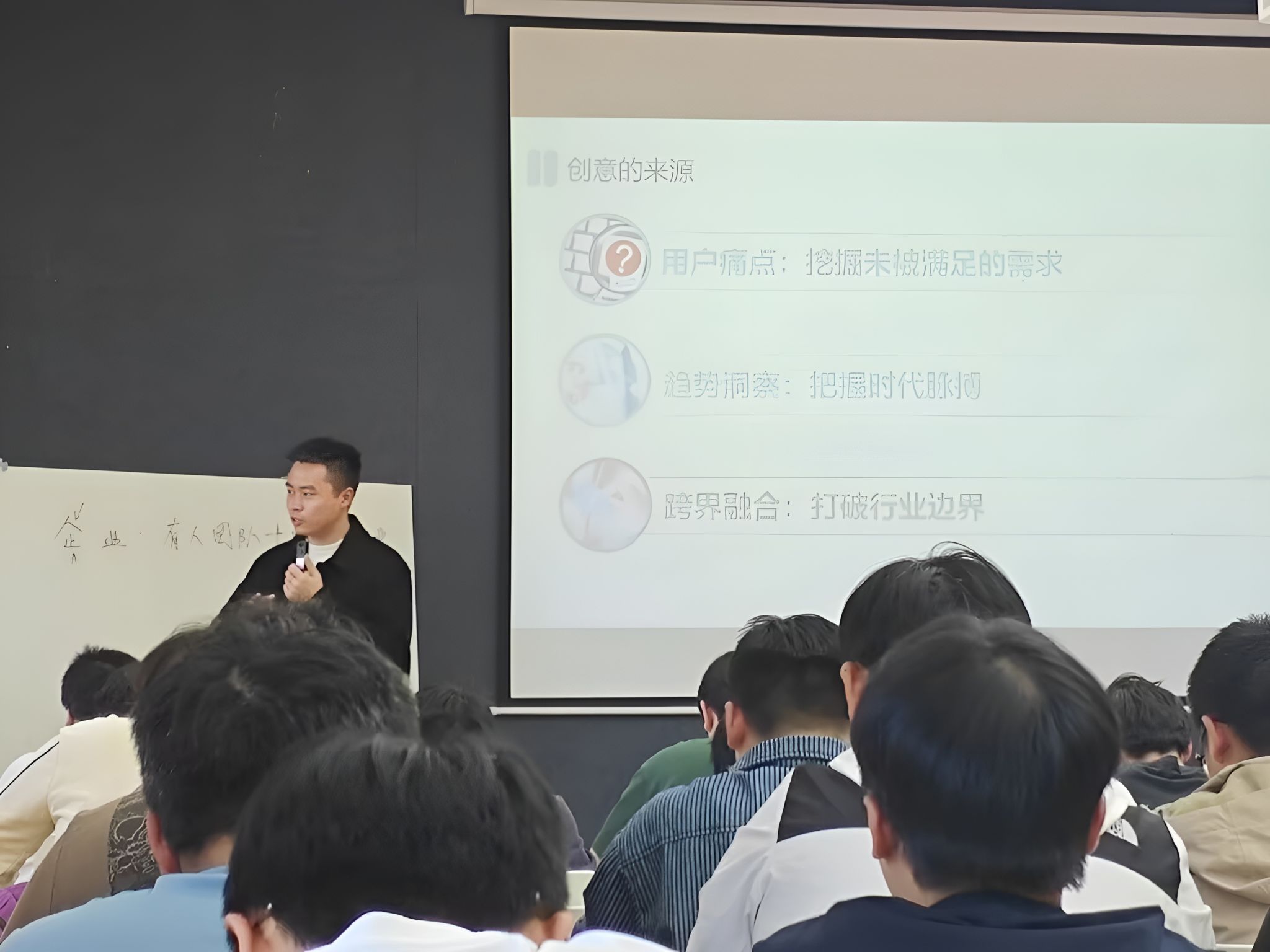 在商业模式构建环节,周顺航老师以“九宫格画布”为工具,带领学生现场推演项目框架。针对初创期资源匮乏的痛点,他提出“最小可行性产品设计三原则”——低成本、快迭代、核心功能聚焦,鼓励学生“用最小成本验证最大假设”。