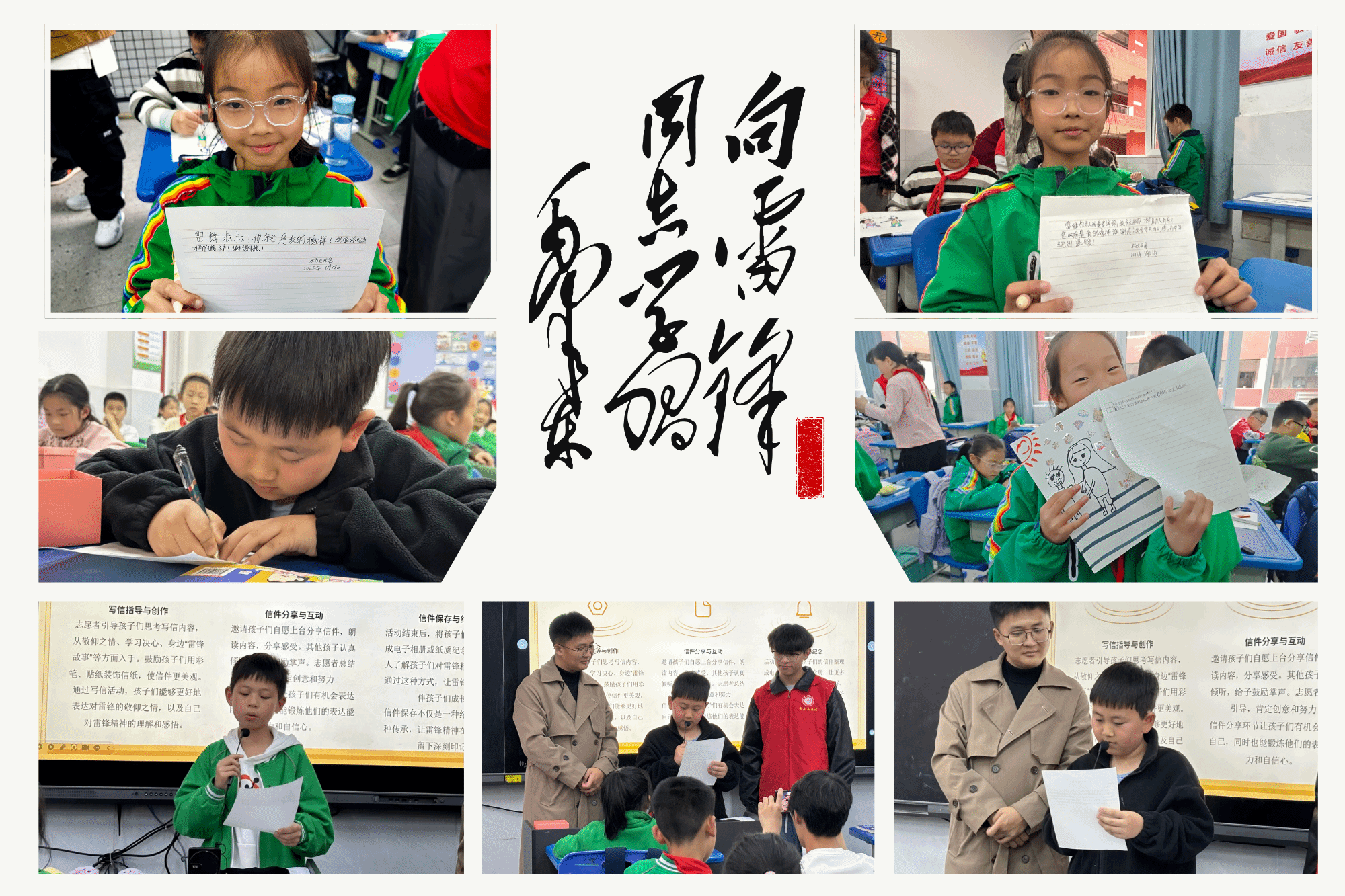“雷锋叔叔,你就是我的榜样。我要向你学习!”在书信环节,孩子们用稚嫩却真挚的文字,向生活中的“雷锋”倾诉心声。志愿者引导他们观察身边的善举——可能是父母深夜盖被的温柔,老师批改作业的专注,或是伤心时同学的问候。白字黑字间,孩子们以文字的力量,和雷锋进行了一场跨时空的对话。这一刻,雷锋精神的理念已深深扎根在他们心中。