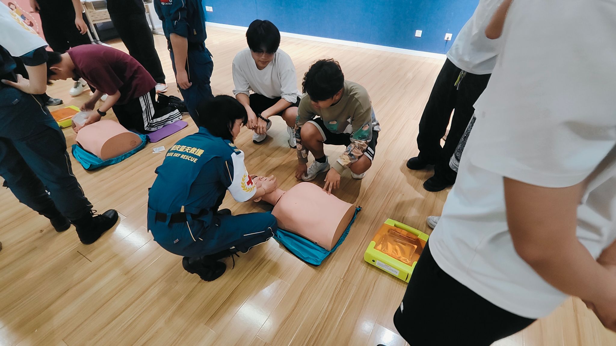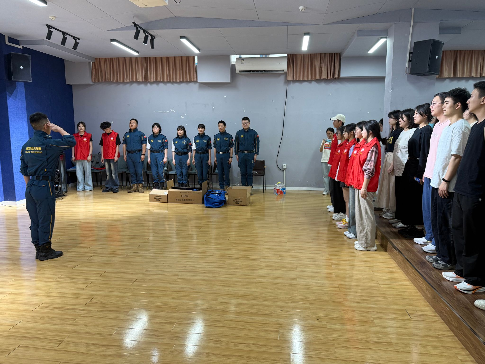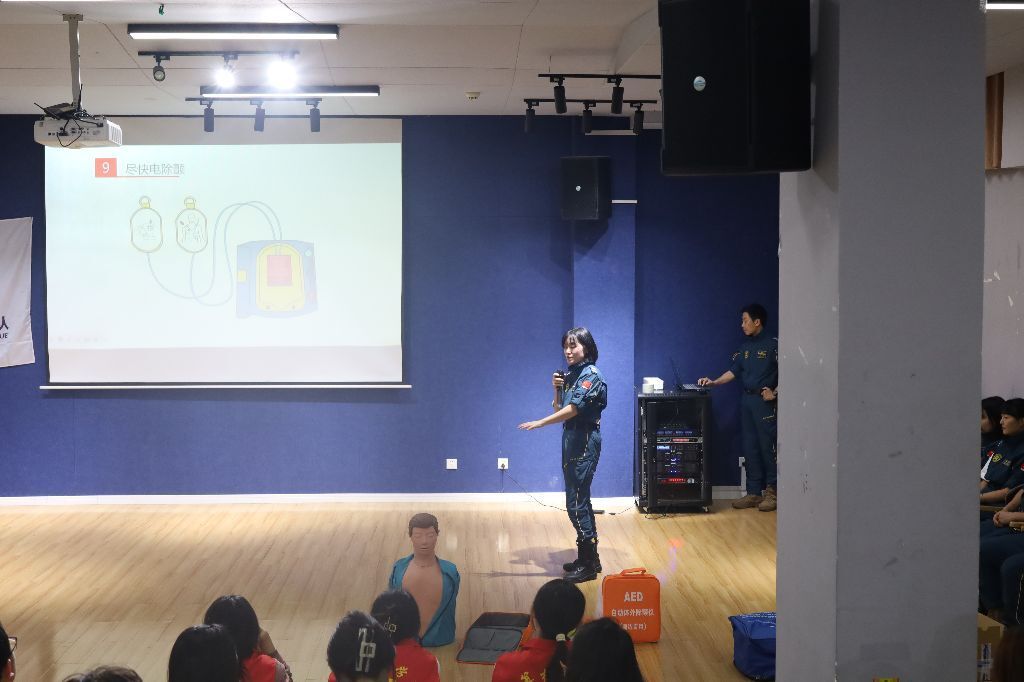 在心肺复苏培训环节,于海队长从最基础的胸外按压和人工呼吸技巧讲起,动作规范且细致。讲师一边示范,一边强调:“胸外按压时,双手交叠,垂直用力,频率要保持在每分钟100至120次。”同时,于队着重突出了除颤仪在急救中的核心地位。他详细阐述道:“当心脏骤停发生时,每延迟一分钟使用除颤仪,患者的生存几率就会大幅下降。”随即,于队现场展示如何迅速开启除颤仪,精准地将电极片贴在患者正确位置,果断按下放电按钮。过程中,还邀请了几位同学上台实操,讲师在旁耐心纠错,手把手指导,让同学们切实掌握除颤仪的使用精髓。