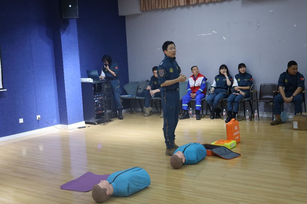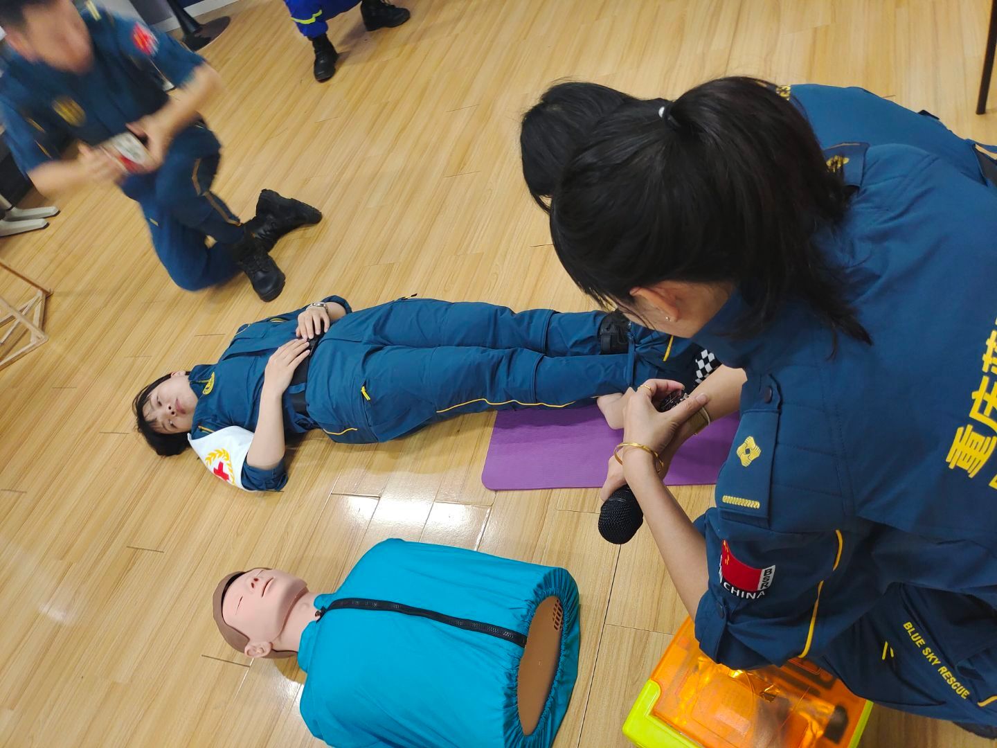 模拟车祸现场救援培训把气氛推向高潮。现场模拟了车辆碰撞、人员被困等复杂场景。同学们在杨队员引导下,迅速分工协作。有的负责观察伤者的伤势,判断意识状况;有的第一时间取出除颤仪,准备应对可能出现的心脏骤停情况;还有的小心翼翼地将伤者从模拟车辆中转移出来。杨队员不断穿梭其中,对同学们的操作进行点评和指导,帮助大家在实战演练中提升救援能力。