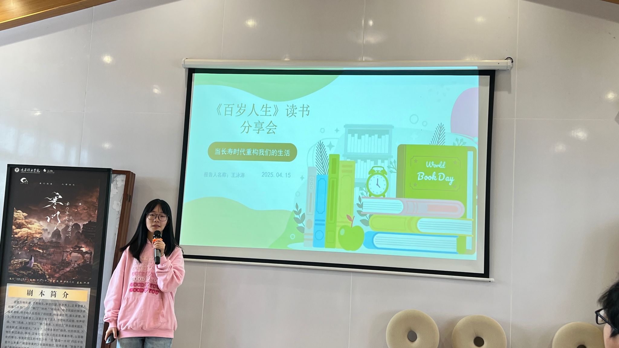 王泳淋同学则分享了《百岁人生》。这本书由伦敦商学院教授琳达·格拉顿和安德鲁·斯科特所著,深入探讨了长寿时代下人类的生活方式和社会变革。王泳淋深入剖析了书中对未来社会的预测与分析,指出随着人类寿命的延长,传统的“三段式人生”将被打破,人们需要重新规划自己的学习、工作和生活。她分享道:“《百岁人生》让我明白,在长寿时代,我们需要具备持续学习的能力和灵活适应变化的能力。书中所提出的‘多段式人生’理念,为我们未来的职业发展和个人成长提供了新的思路和方向。”