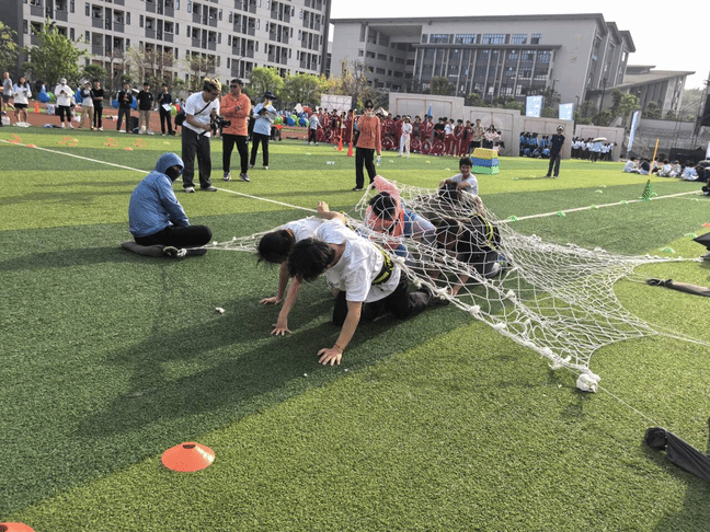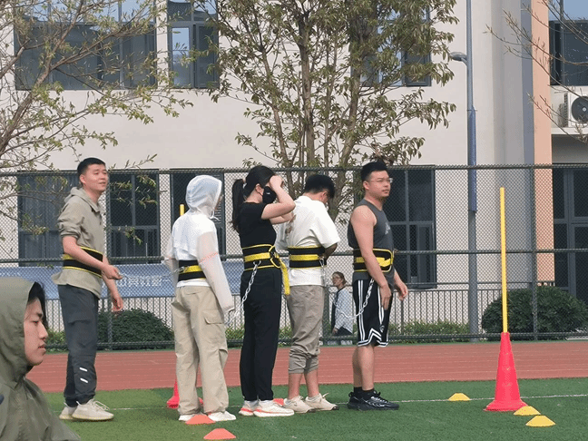 首轮赛事犹如惊险的破冰之旅。学生组一出发便在绕杆区陷入缠斗,锁链牵扯间步伐凌乱,膝盖与手肘在爬行地网时与草皮反复摩擦,划出道道红痕。女队员张明毅在跨越障碍时因发力过猛失衡摔倒,膝盖渗出殷红。"当时只听见队友的呼喊像绳索一样把我拽起来。"她赛后撩起裤脚,伤痕与笑意同样鲜明。教工组同样步履维艰,周海老师在爬地网时被绳索限制动作,手掌磨破却坚持完成比赛。尽管以惊险比分晋级,两支队伍未露疲态,立即在场边展开战术推演。学生组发现绕杆时需统一喊口号控制节奏,教工组则决定由体力好的队员在关键障碍点“领跑”。复盘完后大家围着圈高喊加油,领队张雄书记的呐喊穿透赛场喧嚣。