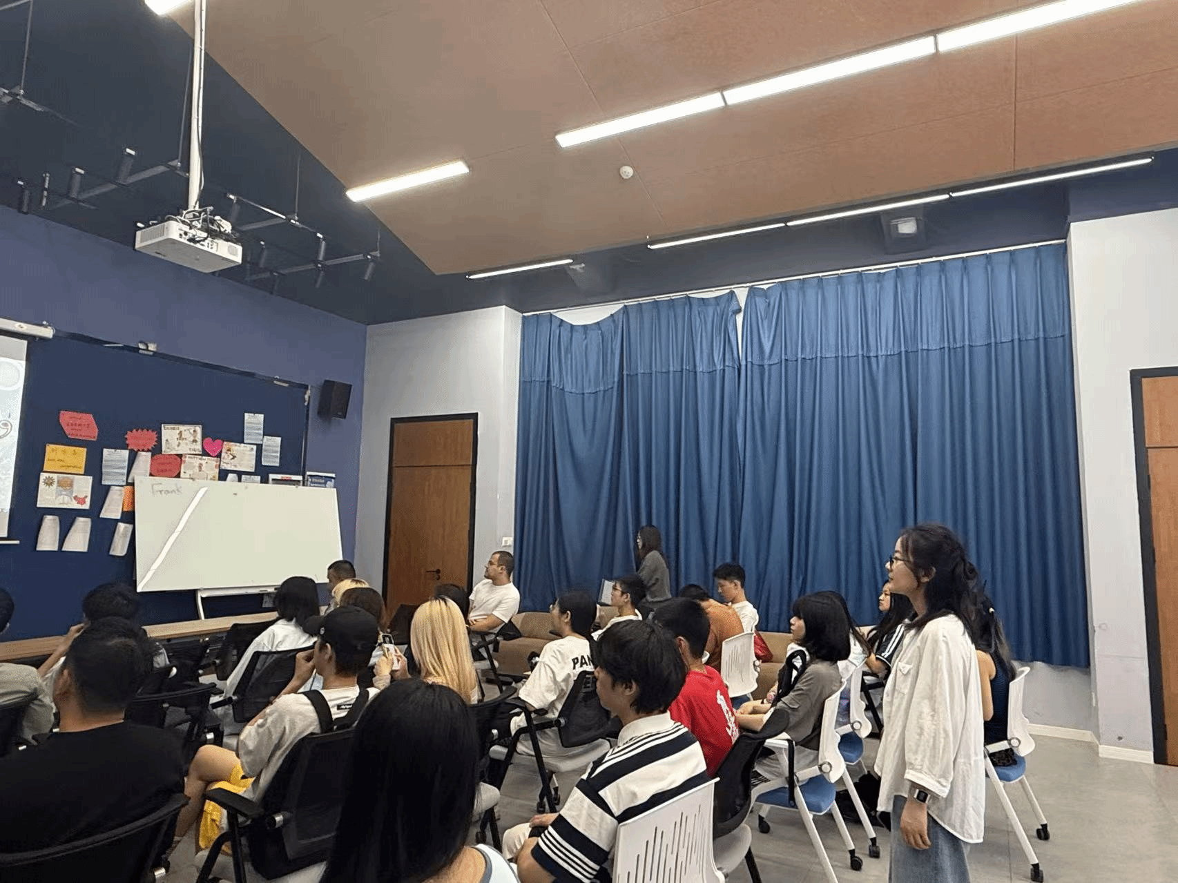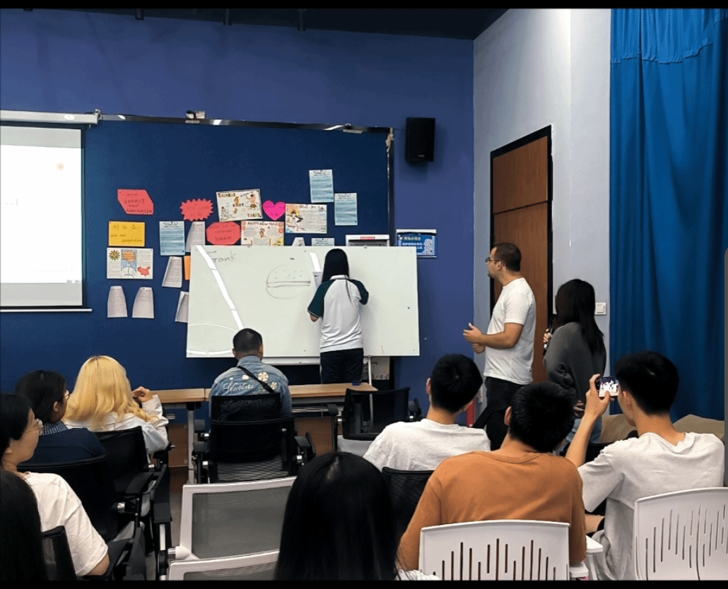 然后,郭冰月老师组织了“你画我猜”活动,将活动推向高潮。同学们用夸张的肢体语言描绘“汉堡包”,用创意简笔画表现“螺狮粉”,引得现场笑声不断。外教老师Frank、徐文清老师和丁倩老师也加入游戏,与同学们打成一片,师生们你比我猜,配合默契,教室里欢笑声此起彼伏。