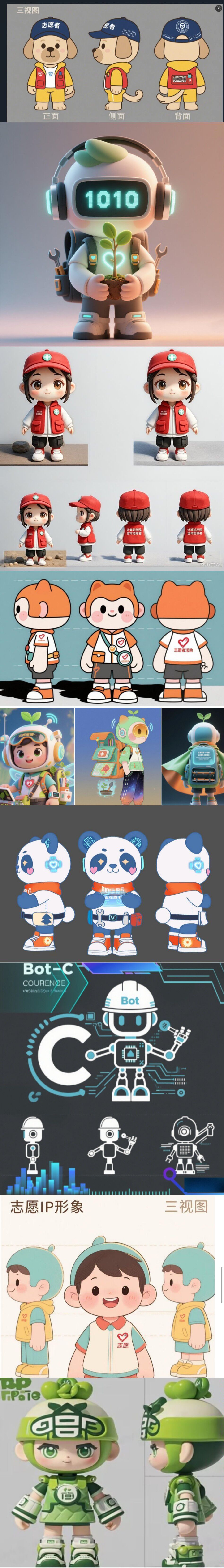 经初步筛选,三件优秀作品脱颖而出,它们各具亮点。“志小芯”以3头身卡通小熊猫为原型,融合计算机芯片、爱心和工具元素,从星星眼瞳到“芯片耳朵”,再到可适配不同志愿场景的工具腰带,无一不体现出科技与公益的巧妙结合,展现出计算机学院的专业特色和志愿者的多元服务能力。“猫猫志愿者”凭借橙色与白色的活力配色,以及类似小狐狸的可爱头部造型,传递出温暖友善的亲和力,其带有志愿者标志的服装细节,凸显了奉献精神。“志愿星使・小援”作为来自公益星云的守护精灵,融合多种色彩,配备可变形斜挎包和智能手环等特色配件,展现出数字化时代志愿服务的创新与活力。