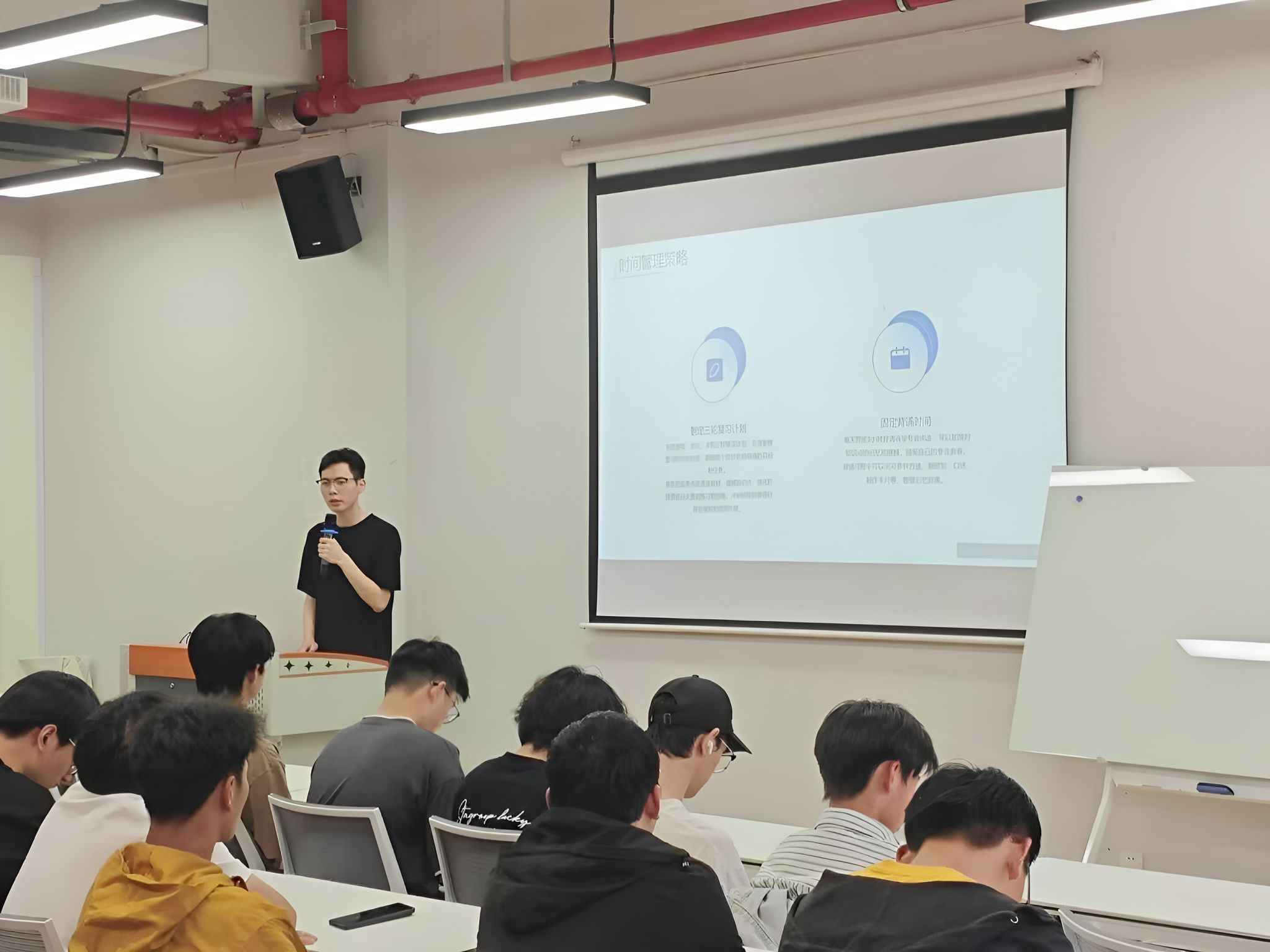 活动伊始,现场气氛热烈而专注。袁德鑫学长结合自身跌宕起伏的考研经历,直击备考焦虑的根源针对计算机学子常常面临的数学难题与代码瓶颈这一双重挑战,袁学长分享了自己独特的应对之策——通过学科交替学习来有效降低疲劳感。他解释道:“长时间钻研同一学科容易产生思维定式和疲劳感,适时切换到另一学科,能让大脑得到新的刺激,从而提高学习效率。”这一实用建议如同一把钥匙,为同学们打开了高效备考的新思路。