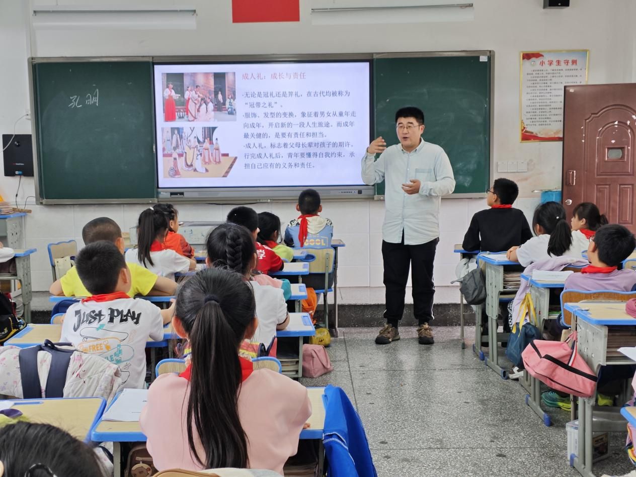 活动中,毛致远老师特别设计了互动问答环节。“你们知道现在多少岁算成年吗?”“怎样才算真正长大?”问题一抛出,孩子们踊跃举手:“18岁!”“会自己做饭!”“懂得帮助别人!”毛老师笑着总结:“古代用冠礼和笄礼提醒青年承担责任,今天的成年不仅是法律上的18岁,更是一颗懂得感恩、勇于担当的心。”