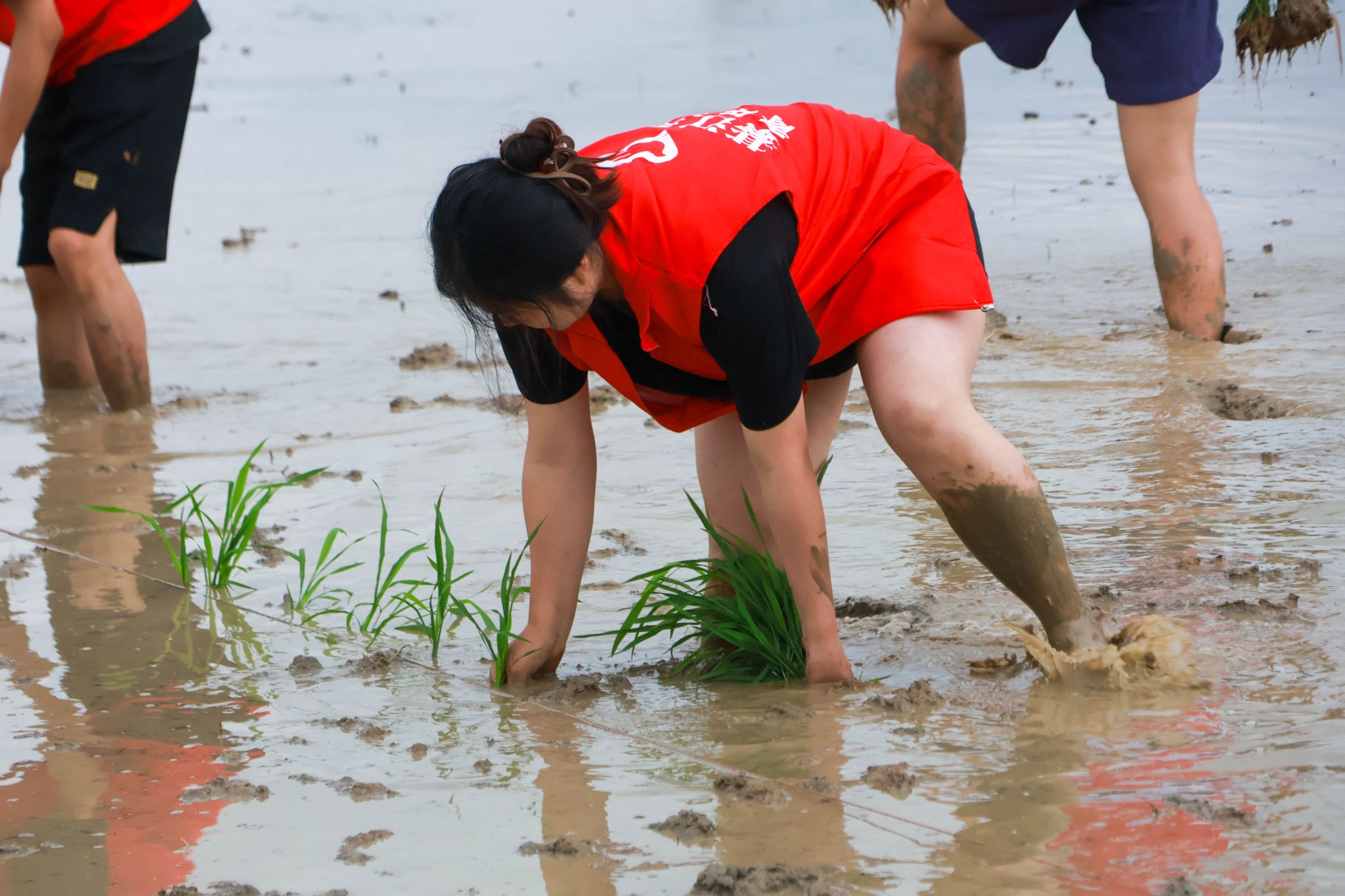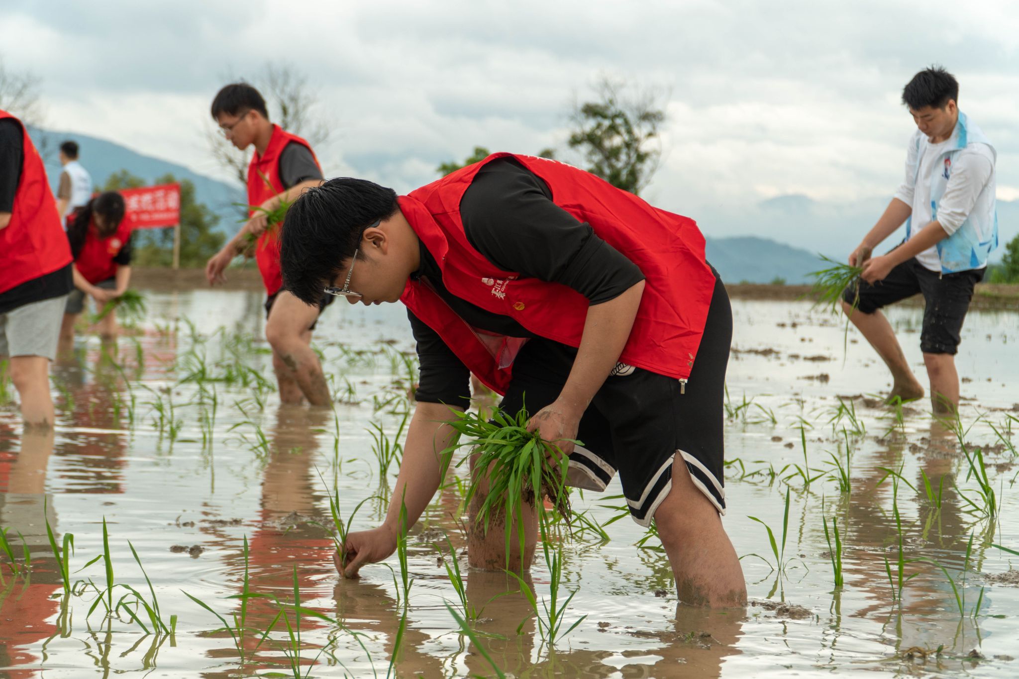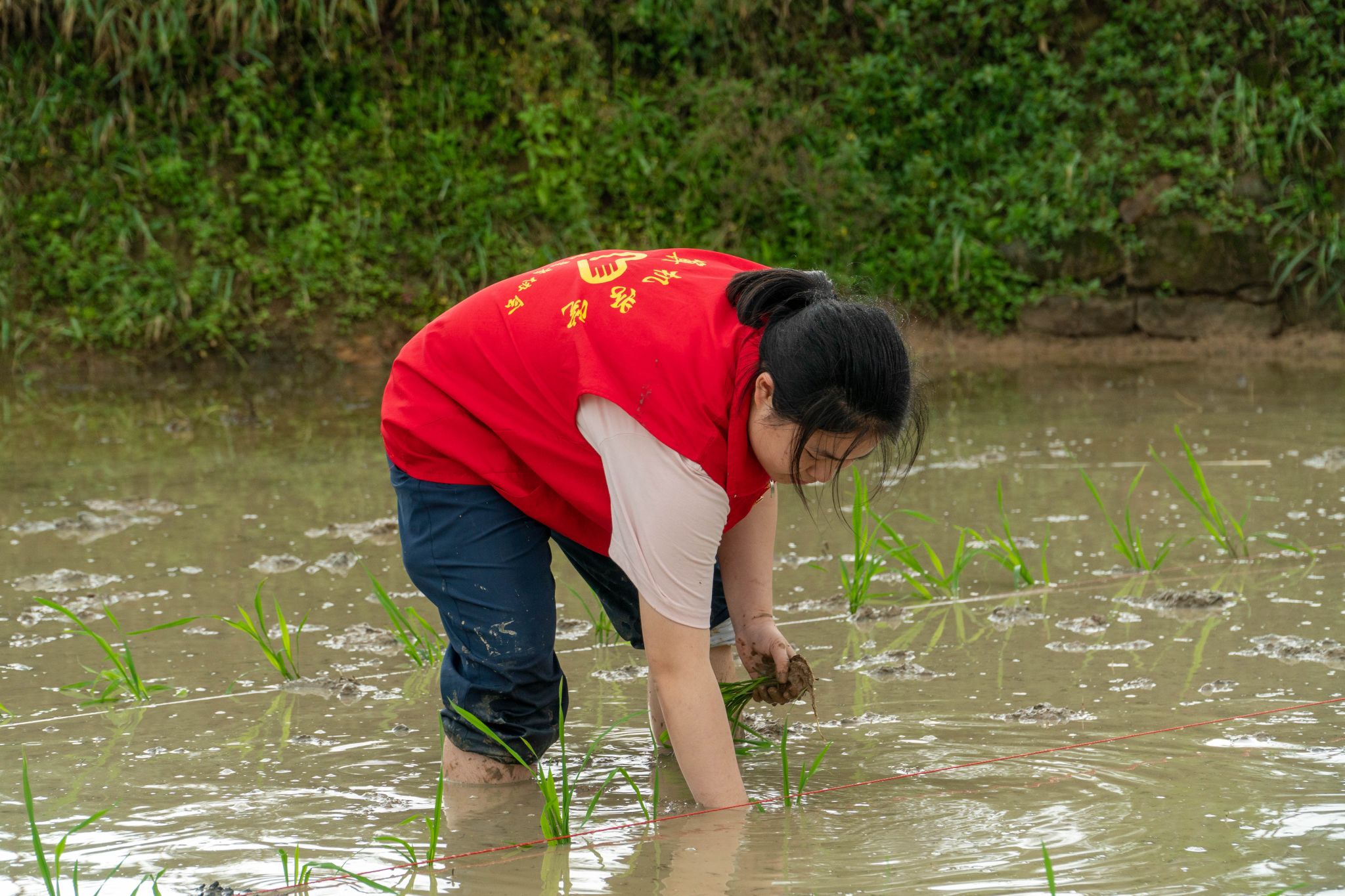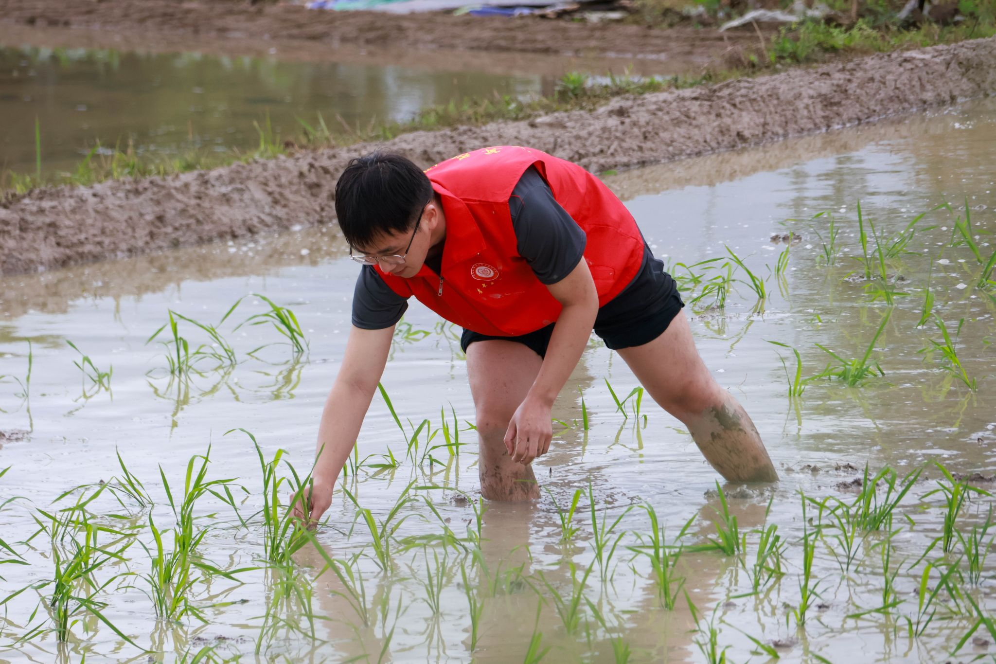 “指尖捏秧根,入土三厘米,退步要稳当!”计算机学院周靖鱼老师一边俯身示范,一边向青年们讲解插秧技巧。他手握青秧,指尖精准控制入土深度,动作行云流水。在周老师的示范下,青年们纷纷踏入水田。大家挽起裤脚、踏入水田,化身“田间能手”,泥浆没过脚踝,却挡不住指尖分秧的利落——拔秧、运秧、分秧、插秧各环节紧密衔接。原本空旷的水田逐渐被葱郁的秧苗覆盖,一排排新绿在微风中舒展,织就一幅充满生命张力的田园诗画。