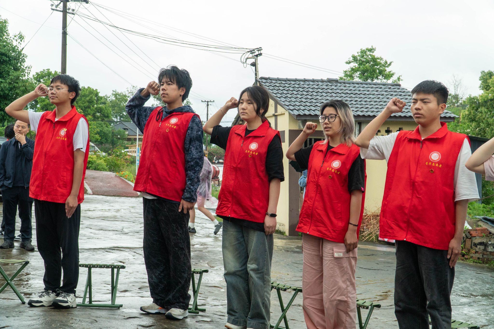 随后,重庆移通学院计算机学院大一学生王君威带领大家重温入团宣誓。在鲜艳的团旗下,青年们举起右拳,庄严宣誓:“我志愿加入中国共产主义青年团……”铿锵有力的誓言在田间回荡,与秧田雨声共振,青年们胸前的团徽在灰蒙天色中格外明亮。