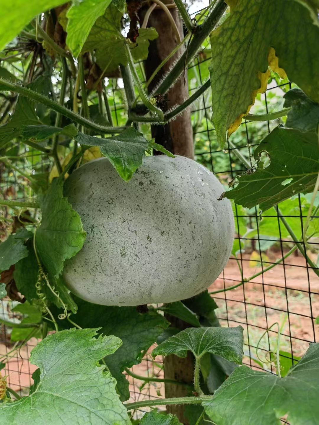 藤蔓间,一颗带着自然斑驳痕迹、挂着晶莹水珠的冬瓜,在绿叶簇拥下透着质朴生机。