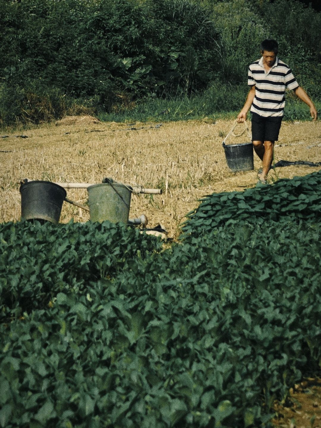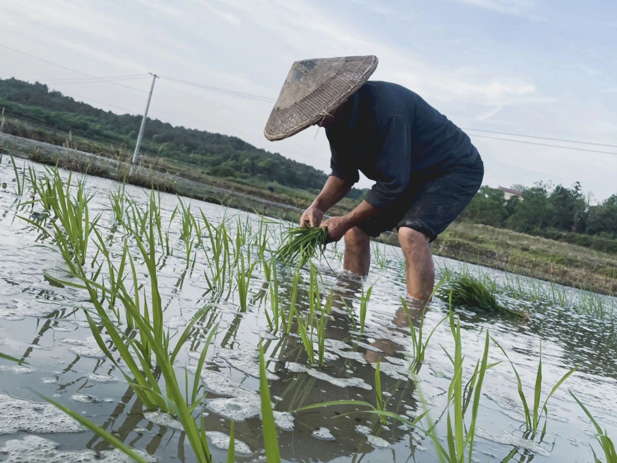 烈日下,农民头戴斗笠,于水田中弯腰插秧,以辛勤勾勒出农耕的质朴与坚韧。