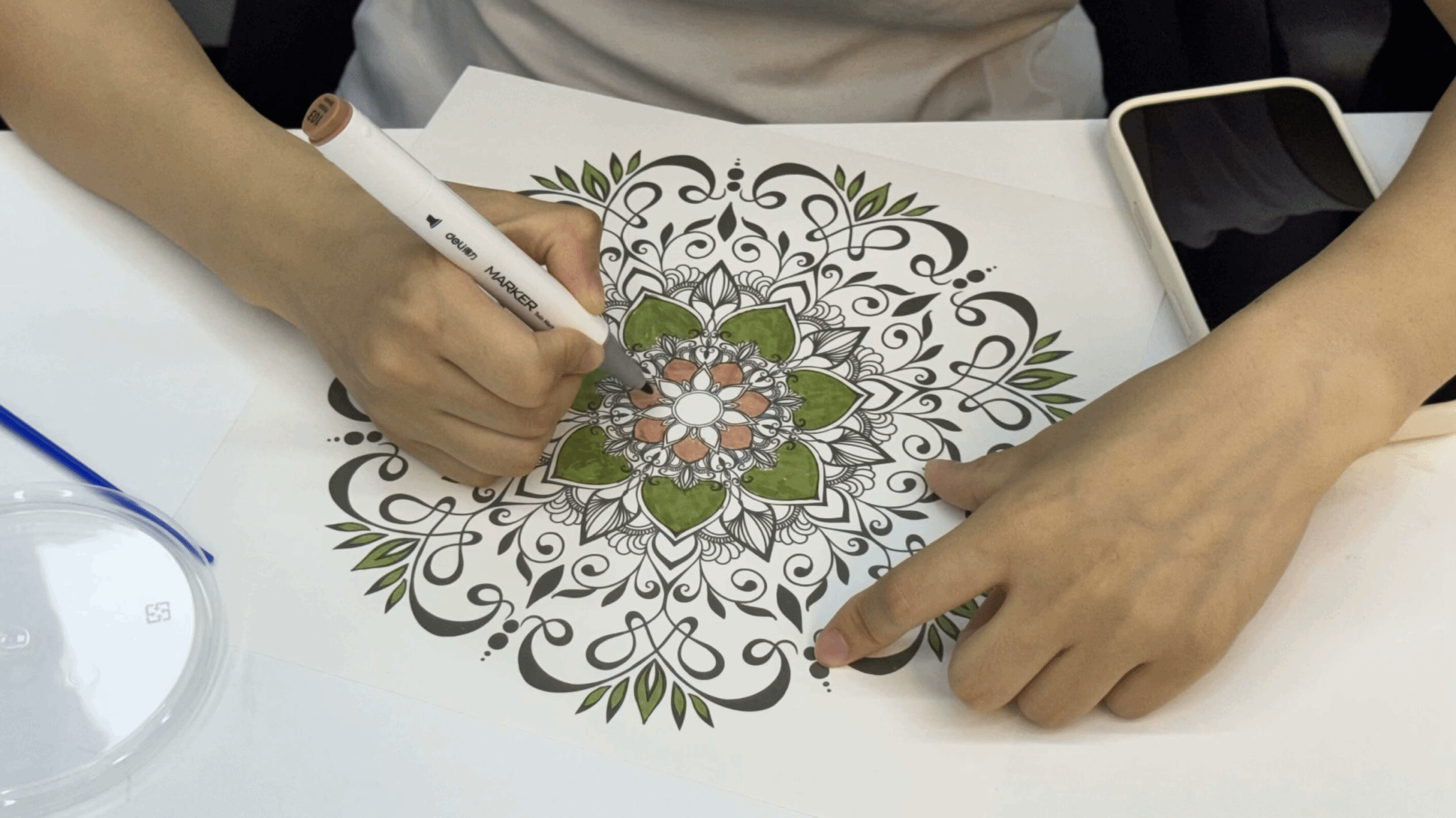 自由创作环节堪称活动的核心亮点。现场瞬间安静下来,每个人都沉浸在属于自己的艺术世界里。大家拿起画笔,或精心勾勒线条,或大胆涂抹色彩,将内心的情绪与思绪倾注于画纸之上。随着时间推移,一幅幅风格迥异的曼陀罗作品逐渐成型:有的用热烈的红色展现澎湃的活力,有的以柔和的粉色传递内心的温柔,每一笔都承载着独特的情感密码。