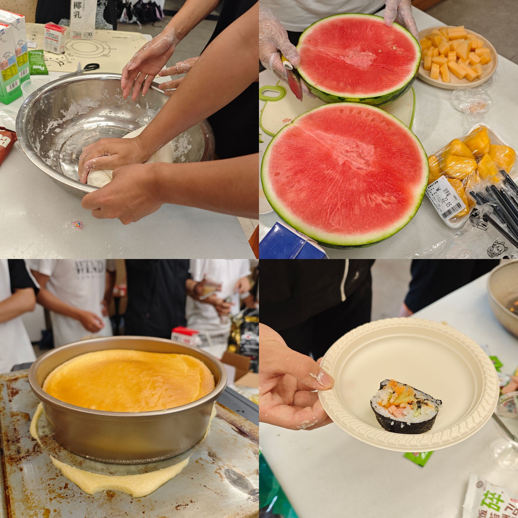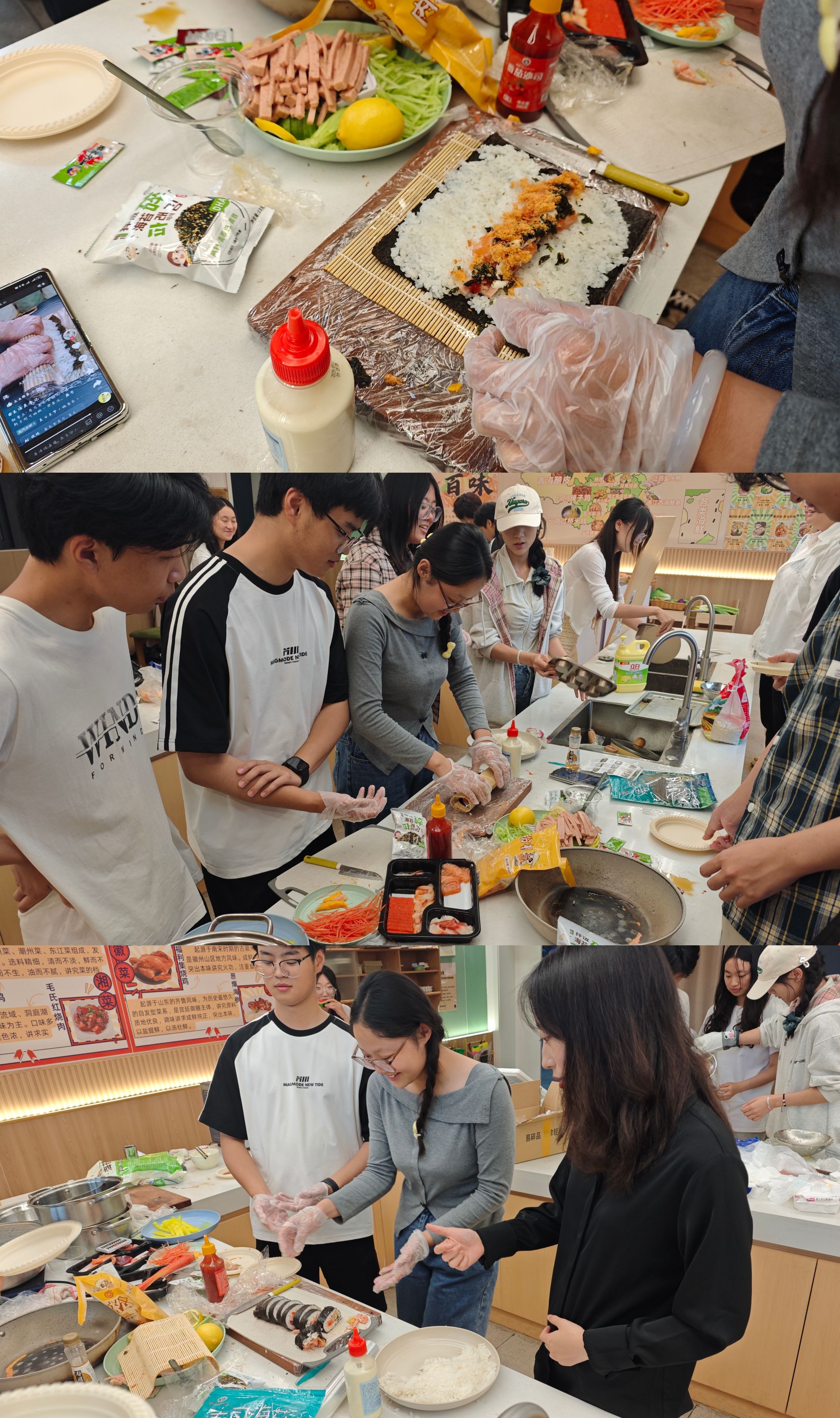 寿司组的同学们第一次尝试运用竹帘,将米饭、海苔与黄瓜、胡萝卜、火腿、三文鱼生鲜等食材巧妙搭配,制作出造型各异的寿司。蛋糕体验中,各位同学充分发挥创意,根据个人喜好制作各式各样的蛋糕和饼干。大家一边制作,一边交流着自己的制作感悟,现场笑声不断。