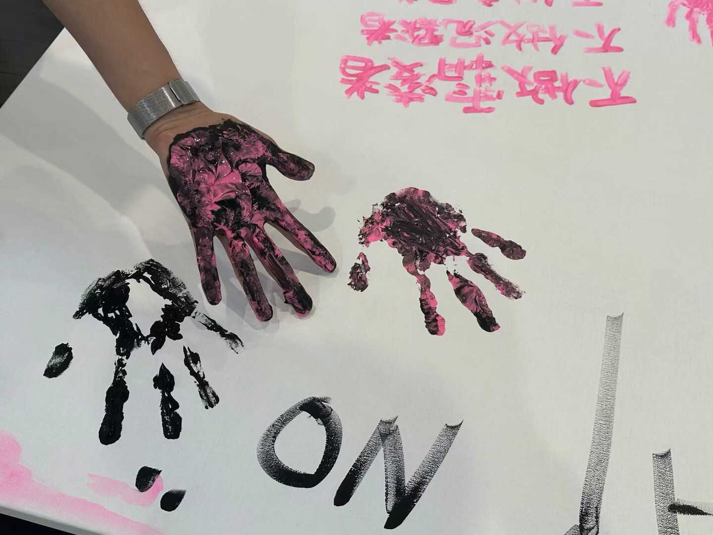一场颠覆性的视觉表达正在上演。二十双沾染粉色颜料的手掌以扭曲形态拓印于画布,宛若一组被暴力灼蚀的图腾。中央破碎的字母"SAY NO"被泼溅的色块拦腰斩断,其下歪斜的"&LOVE"构成尖锐反讽。创作者以象征手法将浪漫与伤痕并置:掌印中暗藏挣扎抓痕,裂帛般的爱心图案间,一行潦草的"TEAKE"字样如幽灵浮现,直指施暴者轻佻的恶意。