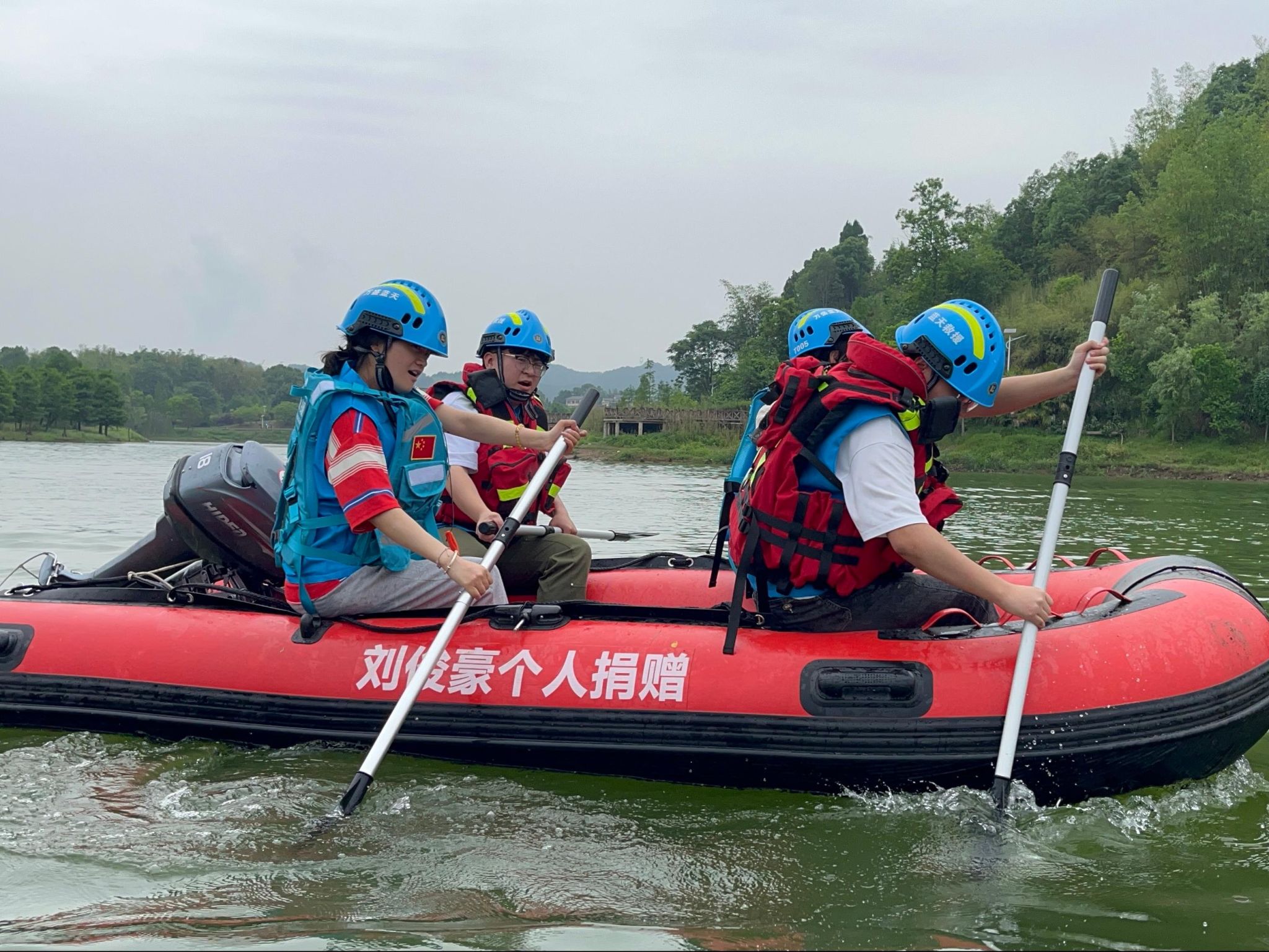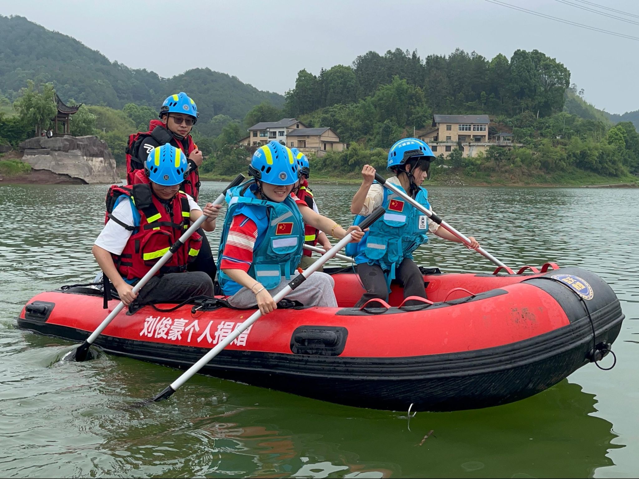 在操舟训练及翻船环节,参训人员分组进行操舟训练,学习舟艇操控的基本手势、前进、后退、转弯等技巧,在实践中提升对舟艇的操控能力。在翻船自救培训中,蓝天救援队队员在做好充足安全保障的前提下,为参训人员讲解并演示翻船落水自救方法,参训人员积极参与实操,进一步掌握了翻船落水自救技能。