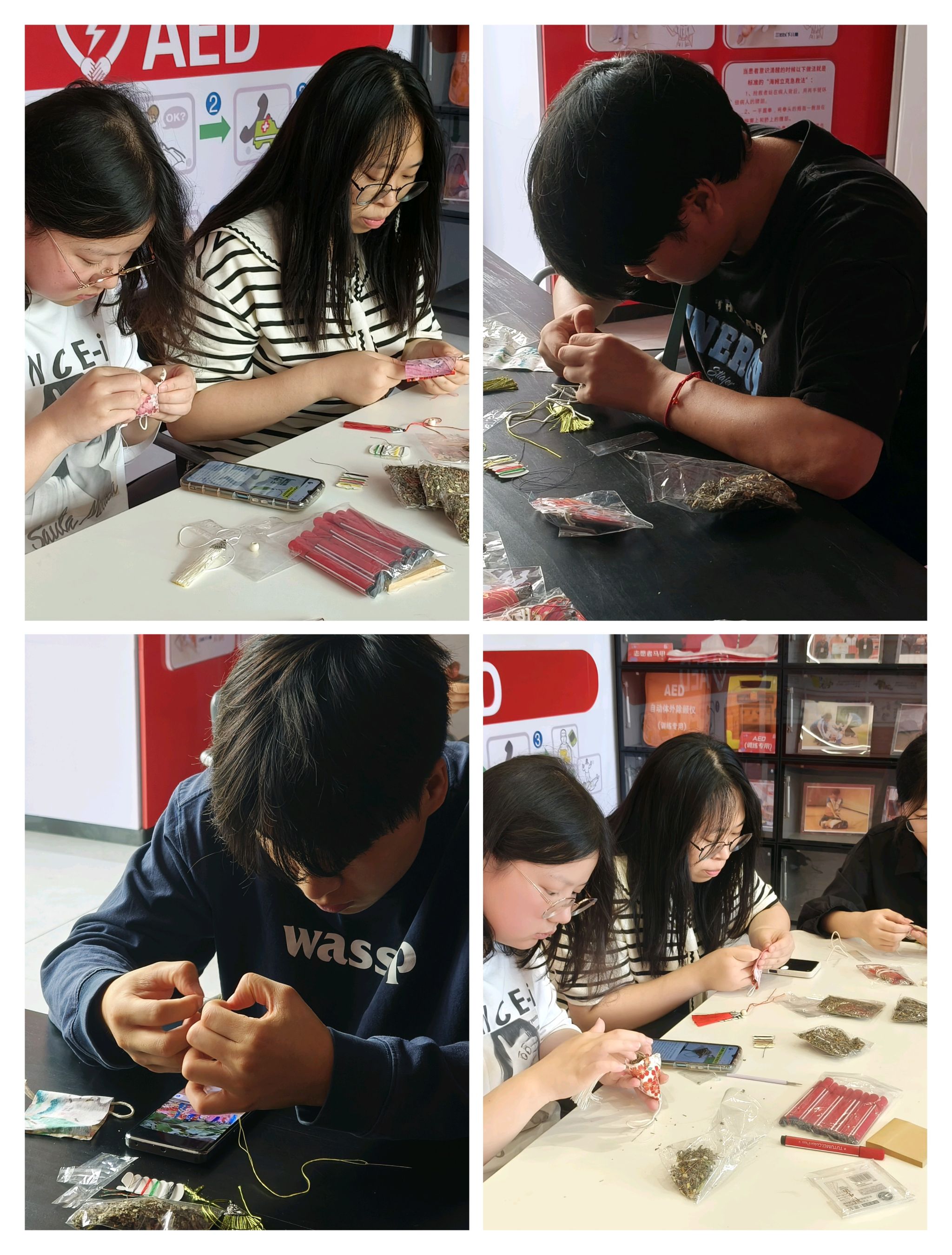 活动伊始,主持人张浩然从端午起源的 “屈原投江” 传说讲起并展示了包粽子、赛龙舟、挂艾草等传统习俗,结合视频片段重现了古人端午祈福的场景,让在场学生深刻感受到节日所承载的文化内涵与民族情感。让同学们知道原来香囊里的艾草不仅有驱虫作用,还蕴含着‘驱邪避灾’的美好寓意。在文化讲解后,志愿者们分发了 20 套香囊 DIY 材料包与空白贺卡。在教学视频的指导下,学生们专注地填充艾草、缝制香囊、书写祝福语句。有人以 “平安喜乐” 为主题设计香囊纹样,有人在贺卡写下端午安康,每一份手工作品都凝结着创意与心意。