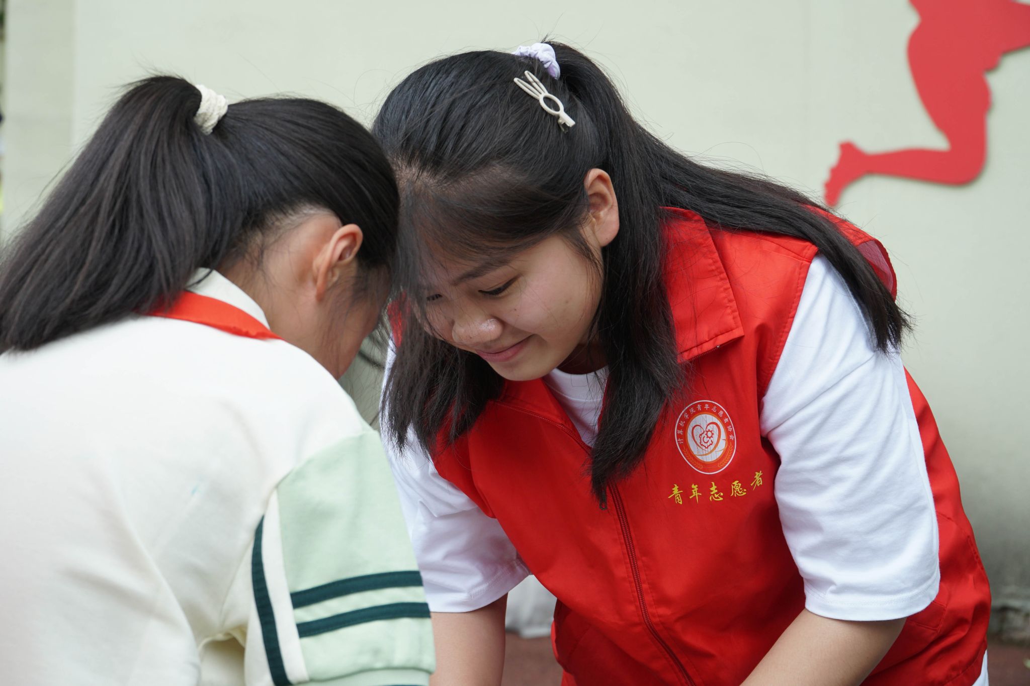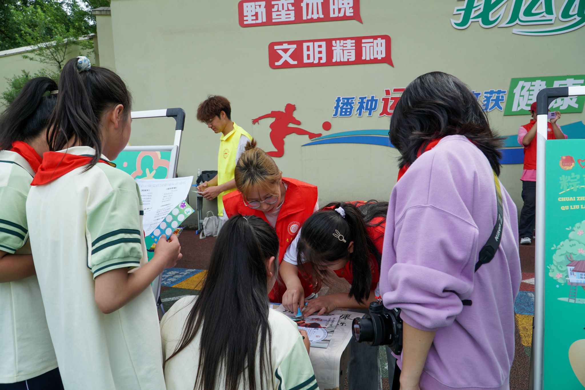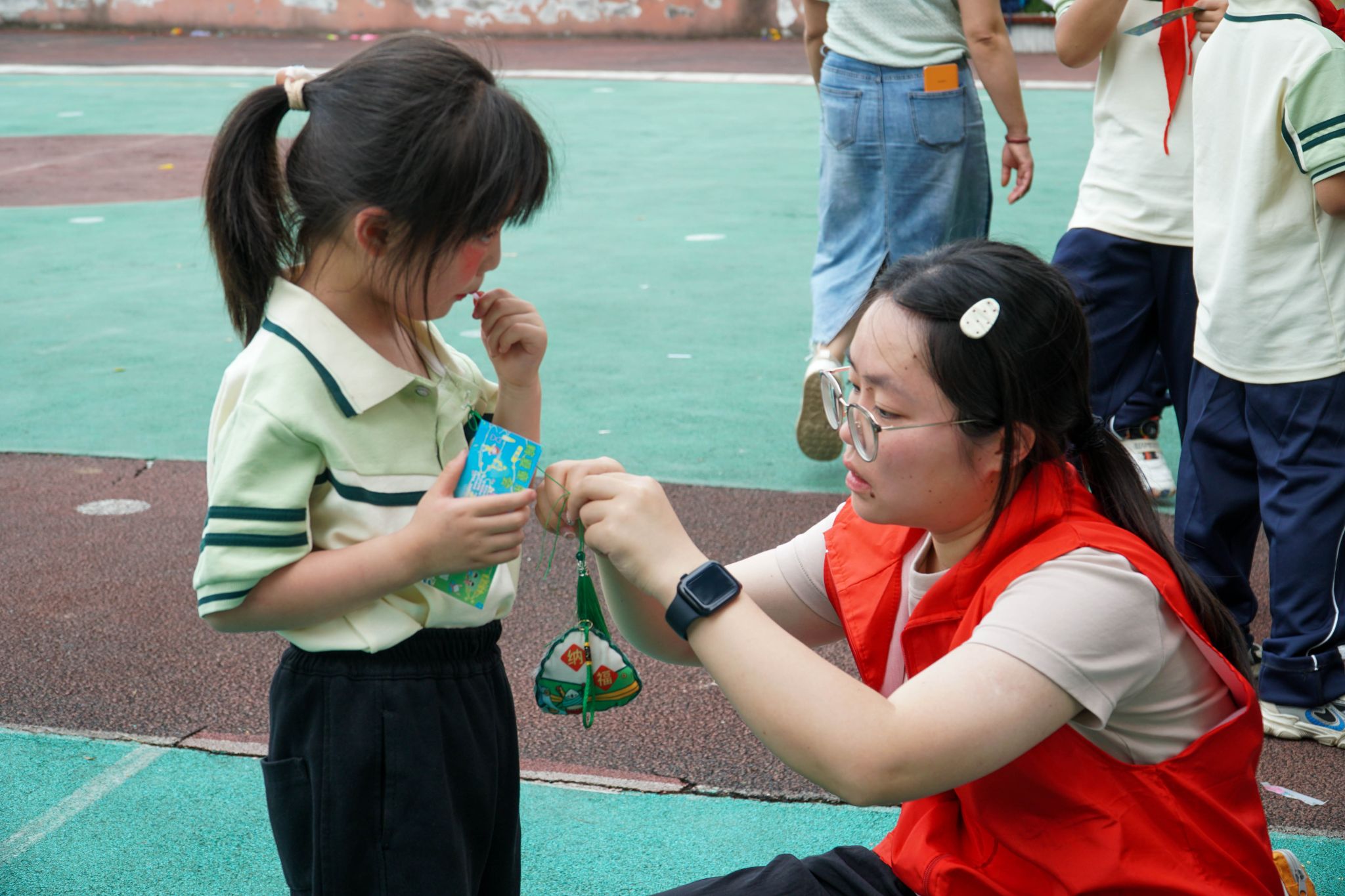 除传统六艺外,“欢乐抢椅‘趣’”“两人三足‘趣’”等游戏将现场气氛推向高潮。孩子们在抢椅游戏中灵活应变,在两人三足中默契配合,既收获了奖品,更体会到合作的乐趣。志愿者还通过“礼承端午‘童’”摊位讲解拱手礼、端午习俗,并指导孩子们编织香囊、五彩绳,让传统文化在指尖传承。
