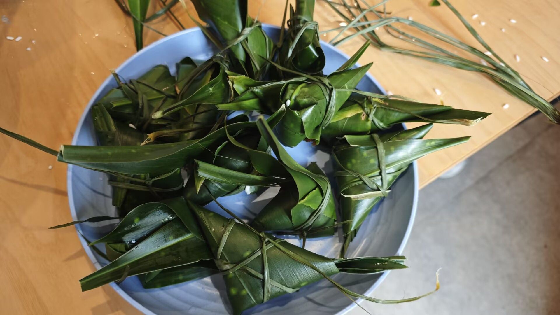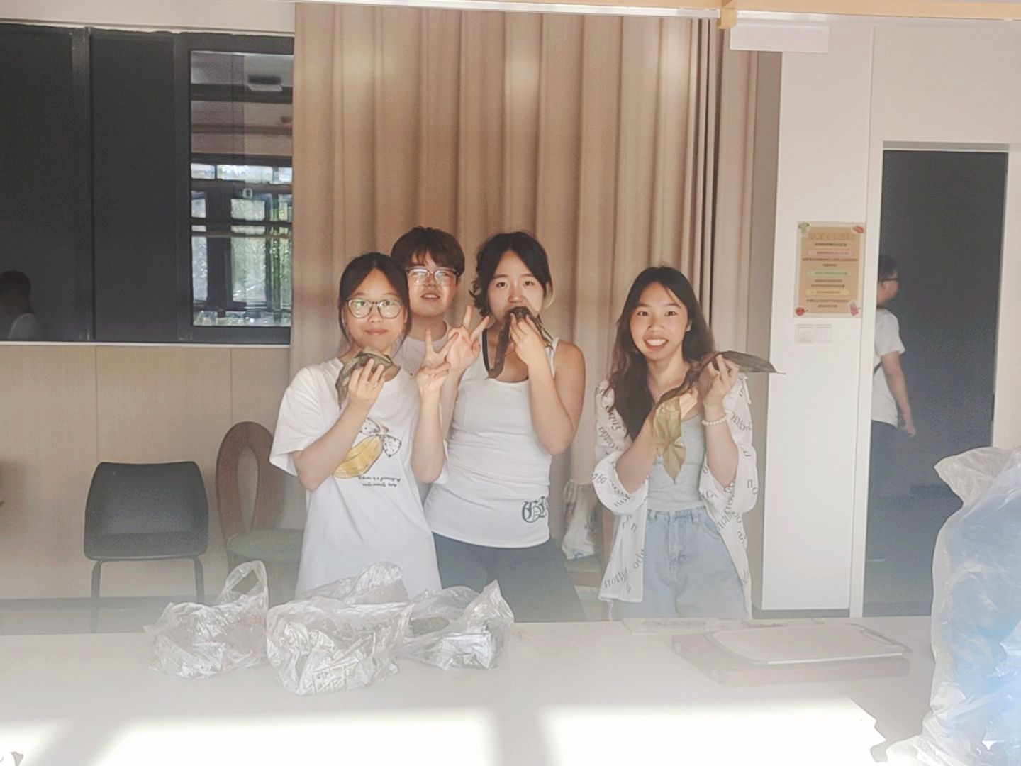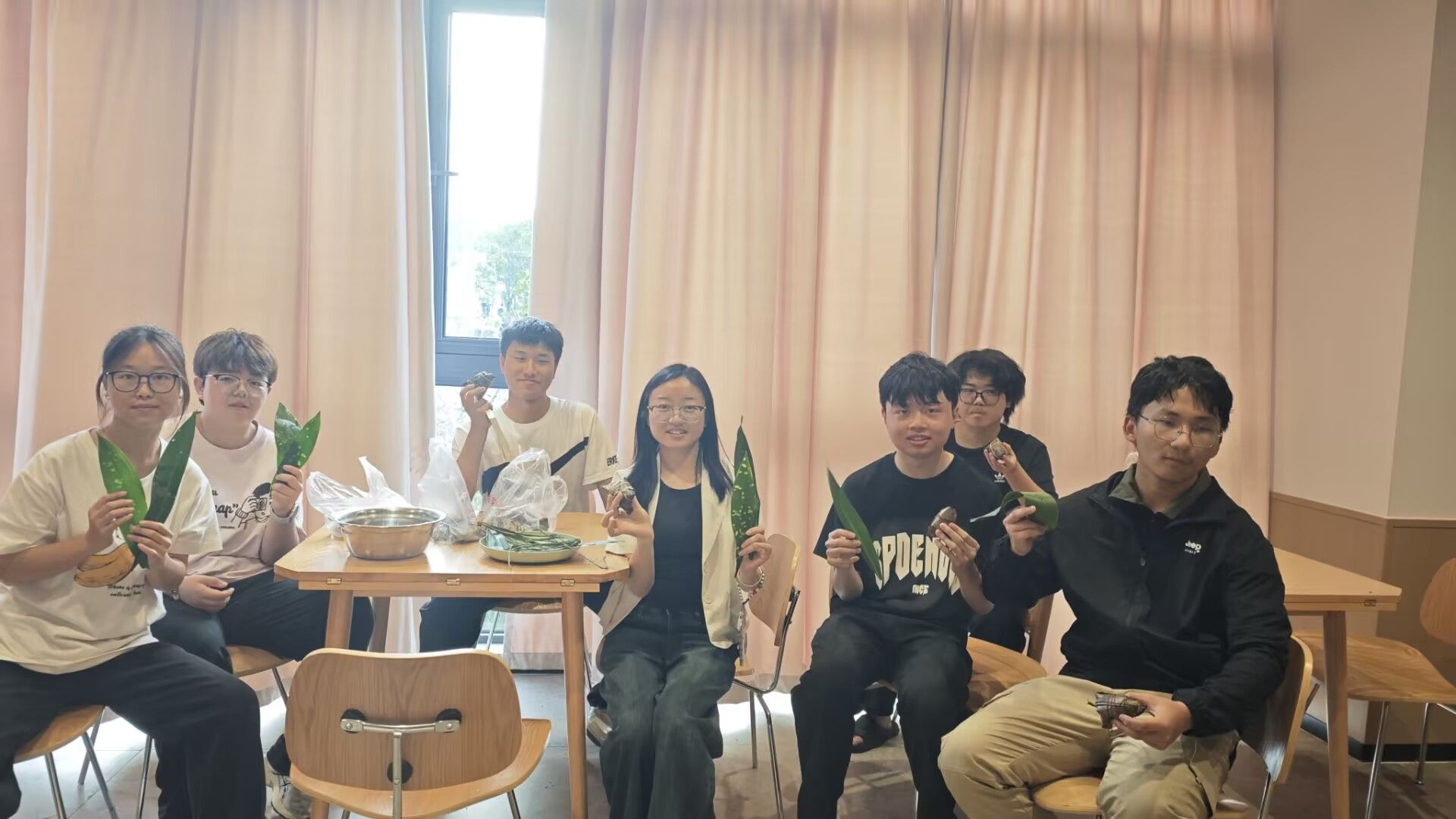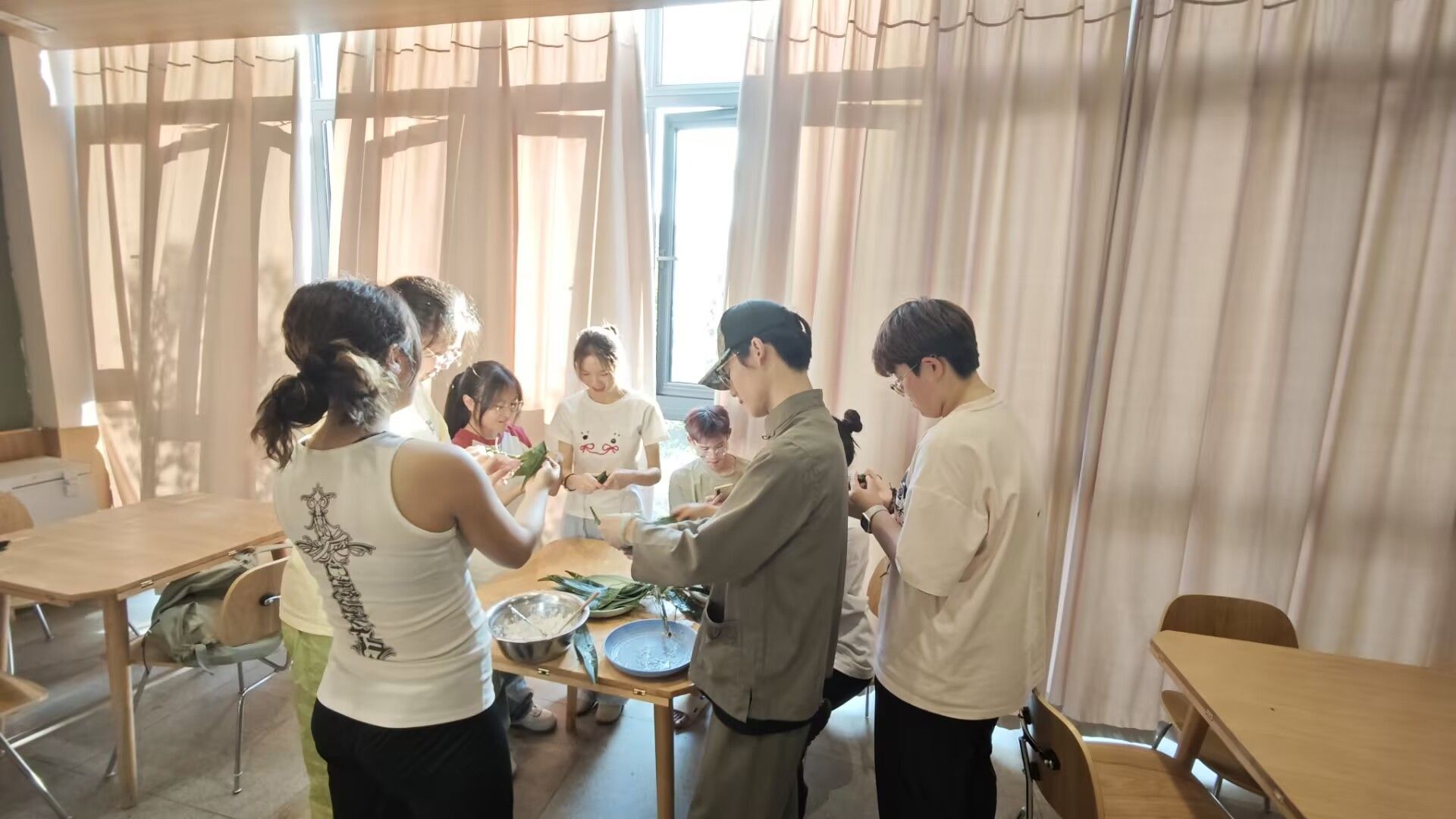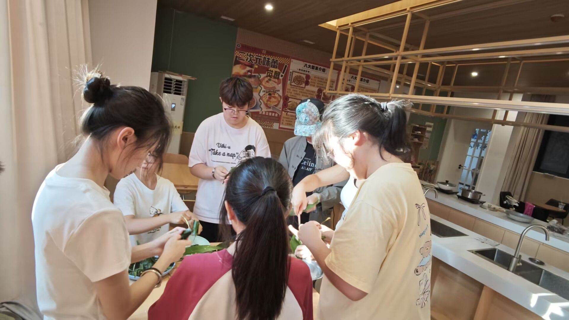 阅读分享结束后,大家开始进行端午包粽子体验。南江共享厨房内粽叶飘香,在导师与几位擅长包粽子的同学们的示范下,大家纷纷动手尝试:折粽叶、填馅料、裹粽叶、系棉线……尽管手法略显生疏,但每个人都神情专注。“这是我第一次亲手包粽子,没想到过程这么有趣!”一名学生举着自己包的粽子兴奋地说。活动特别准备了充足材料,学生们完成的粽子可自行带走,邱祝老师也买来了各种口味的粽子供同学满品尝,让这份亲手制作的端午味道融入异科家庭团圆时刻。