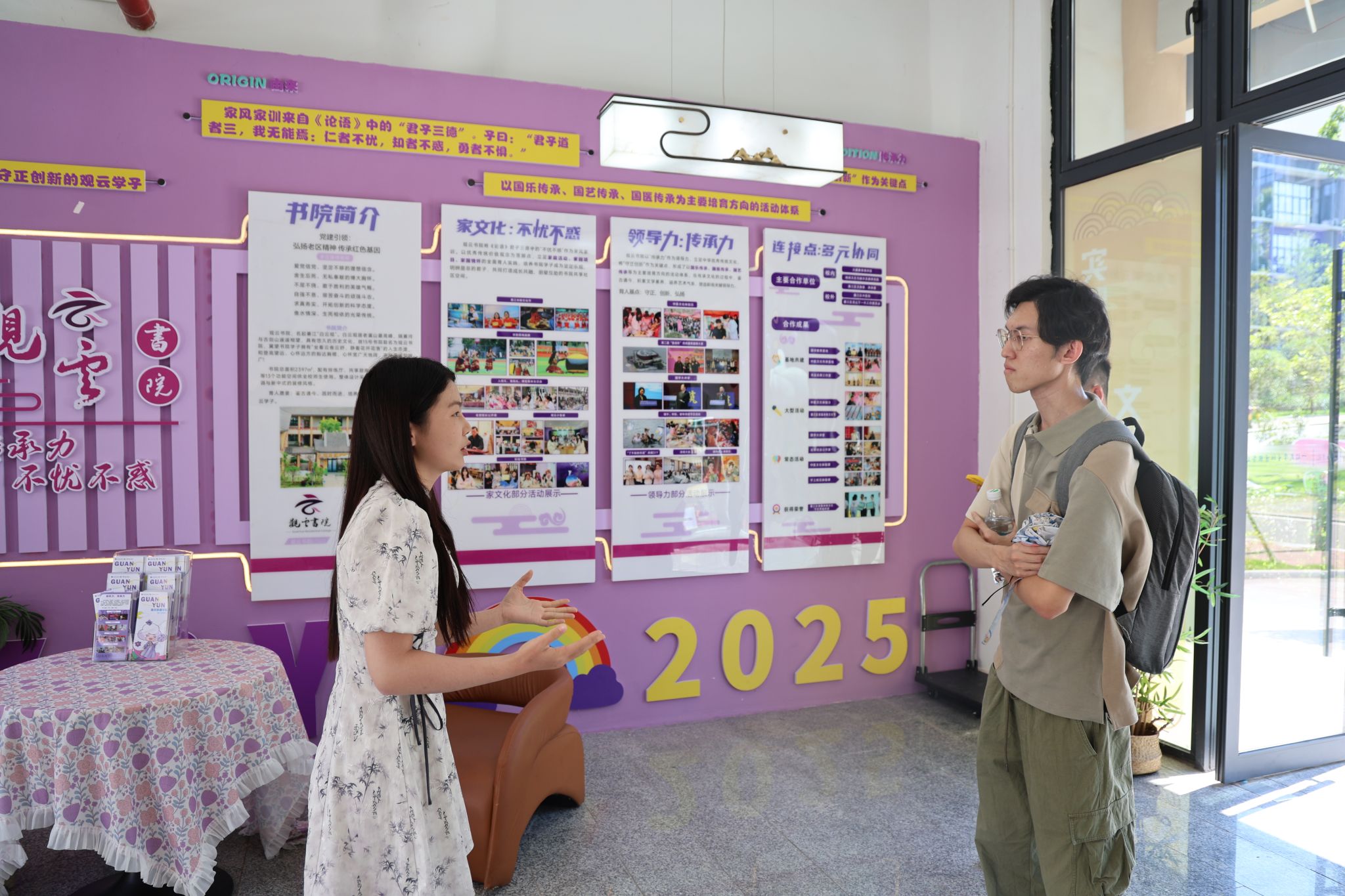 在云端剧本杀学院教师的陪同下,李元锋老师参观了南江书院、观云书院、瀛溪书院与綦河书院。在与异科导师李富强的交流中,他感慨校园环境极富设计感,“比北大的建筑更新潮,校园审美非常契合年轻人品味”。李老师特别点赞学校的书院制育人模式,他表示:“书院不仅是学生的生活空间,更是跨专业成长与自由探索的理想场所。”