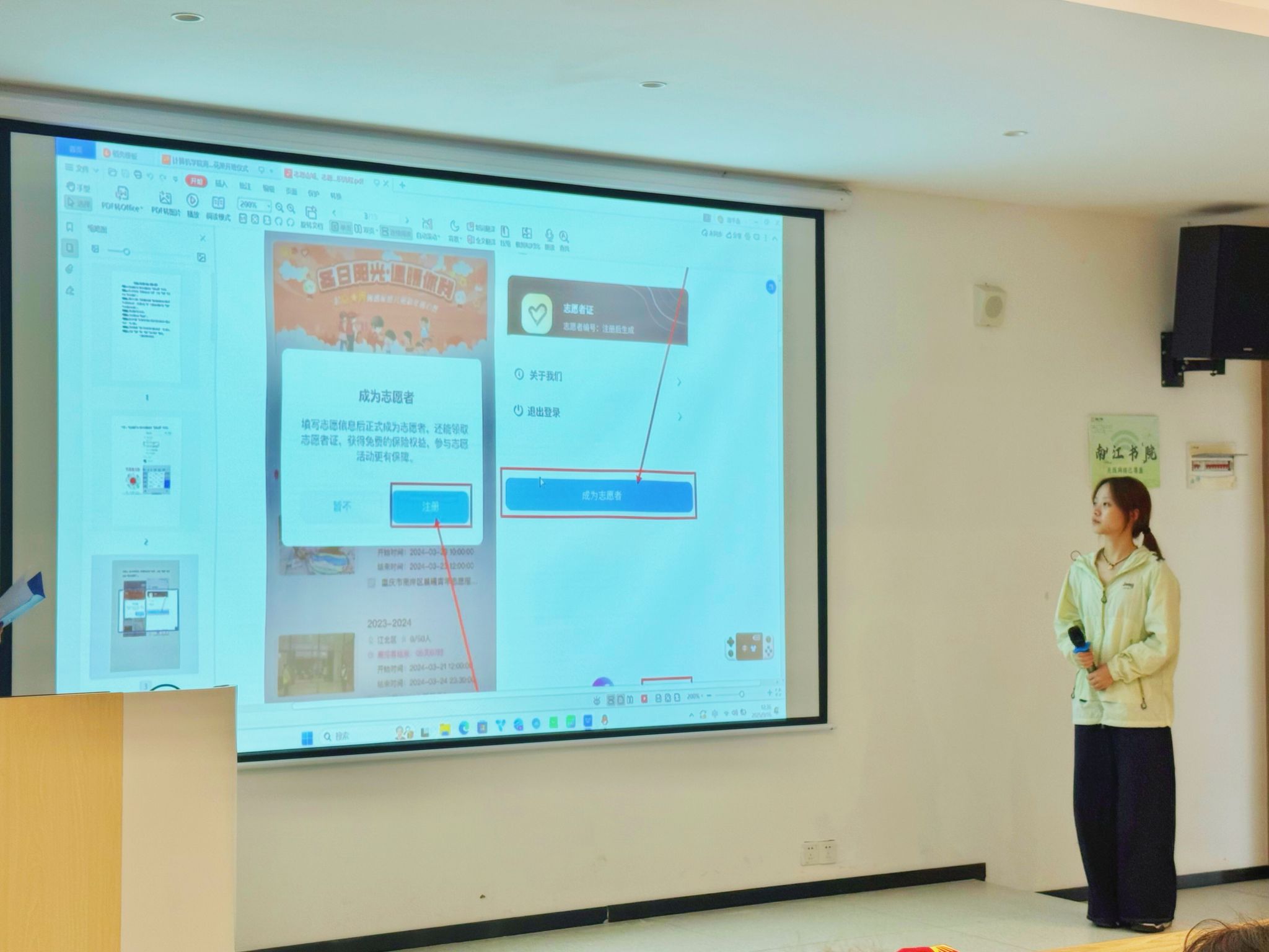 活动步入高潮,计算机学院青协指导老师田雨、主席段海飞依次为“三下乡”优秀项目代表与“返家乡”先进个人颁奖。这份荣誉不仅是对获奖者汗水的嘉奖,更化作激励全体志愿者接续前行的力量。紧接着,计算机学院青协干部代表谭季鑫为在场志愿者开展培训。她分步演示了“志愿山城”“志愿汇”的注册与组织加入操作。完成平台注册既是后续参与志愿活动的便捷前提,也是志愿者身份的正式象征。