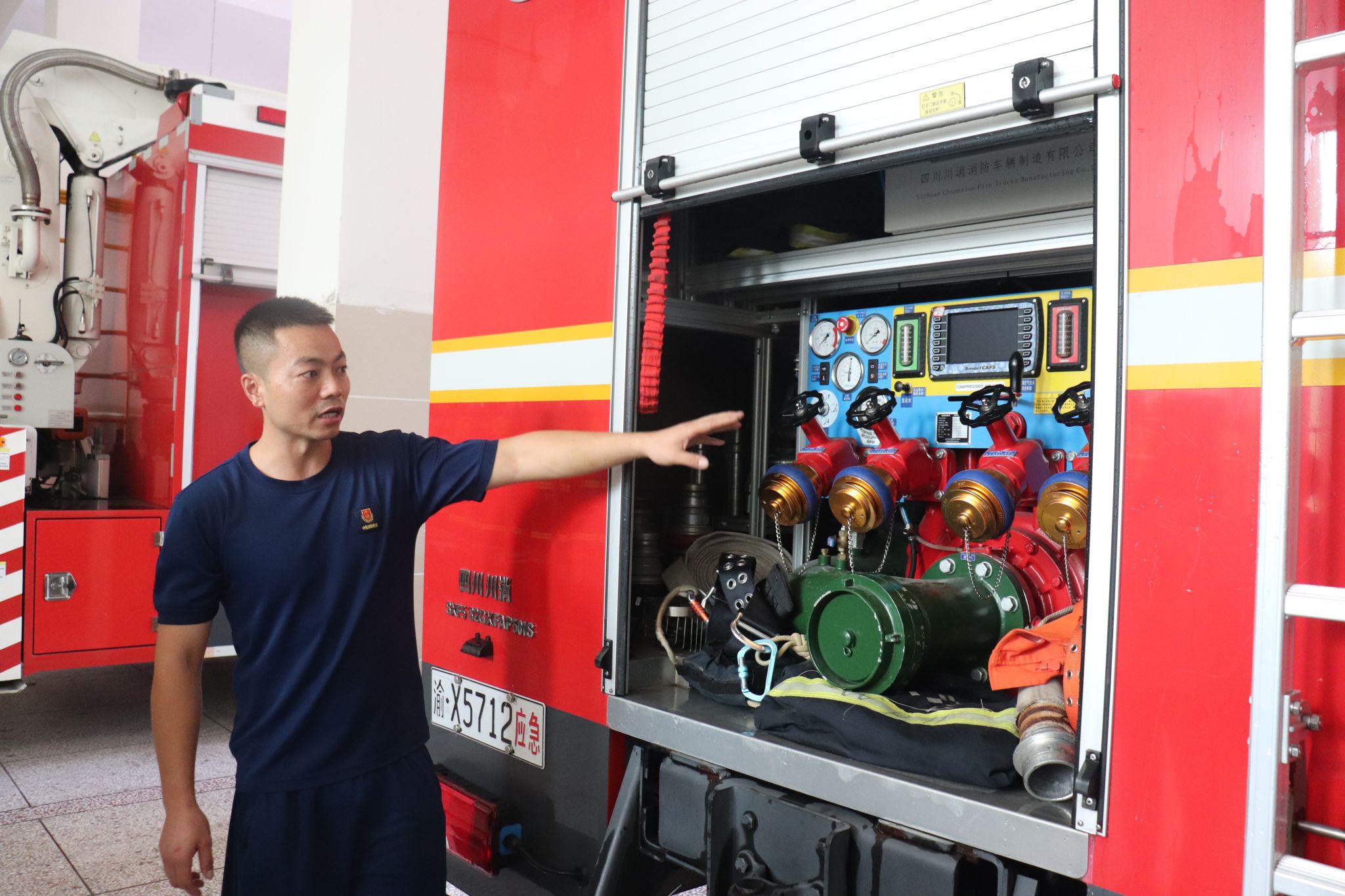 随后,消防站冯成文班长带领志愿者们开启“硬核课堂”,系统讲解各类消防装备的功能与应用。同时在讲解中队员们开始一一提问,激发了大家浓厚的学习兴趣。从承担灭火供水任务的水罐泡沫消防车,到适配高空救援的登高平台车,再到用于破拆救援的液压扩张器、无齿锯等专业设备,每款装备的操作要领与实战场景都被逐一拆解。