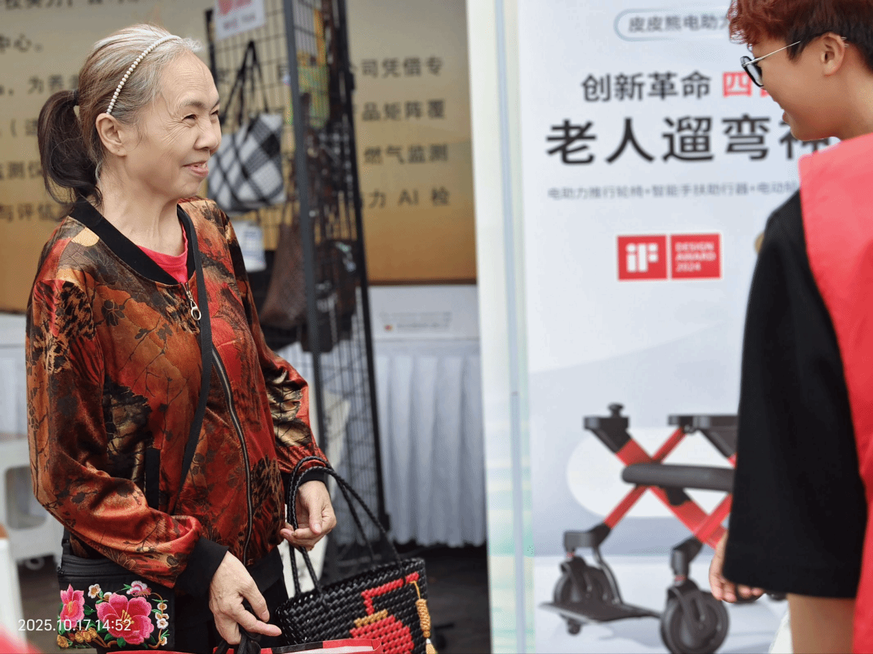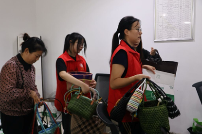 义卖现场人头攒动,却始终井然有序。志愿者们精神饱满,分布在各个角落,全力投入服务。活动通过线下服务、线上直播与摄影记录三线并进,交织出一幅温暖而高效的公益画卷。面对驻足围观的居民,志愿者们主动迎上前,手捧精心编织的藤编包,细致讲解制作工艺与设计理念,当居民对款式犹豫不决时,志愿者便化身“贴心顾问”,结合对方的日常使用习惯,给出暖心推荐。而另一边的线上直播区,则成为公益传播的新窗口。几位志愿者变身“公益主播”,在镜头前流畅展示藤编包的细节与魅力。