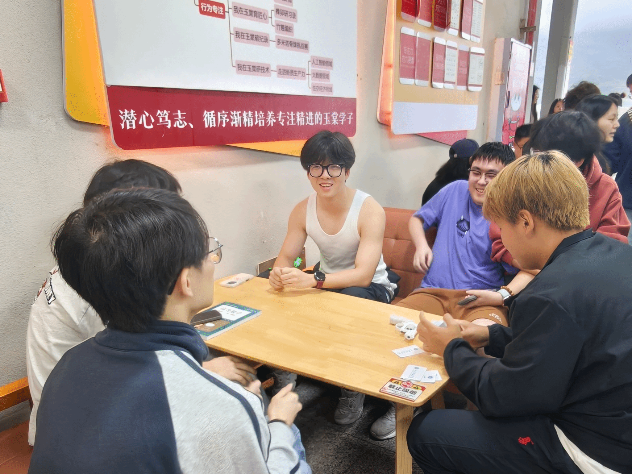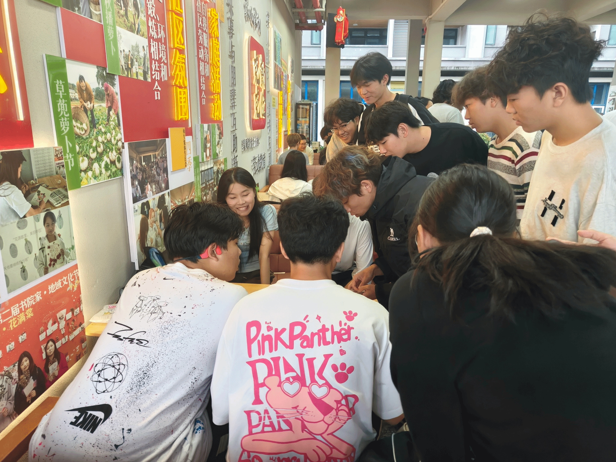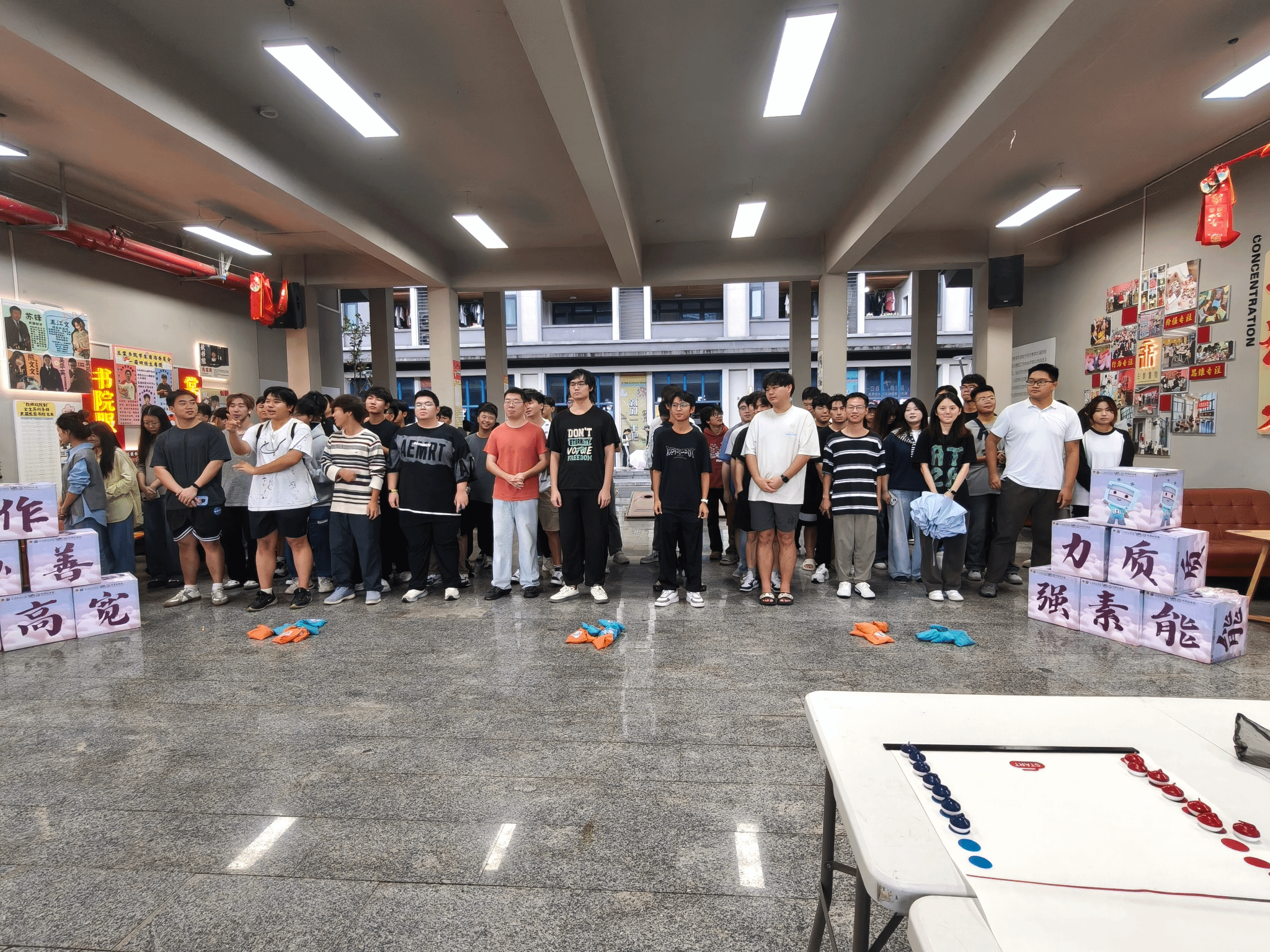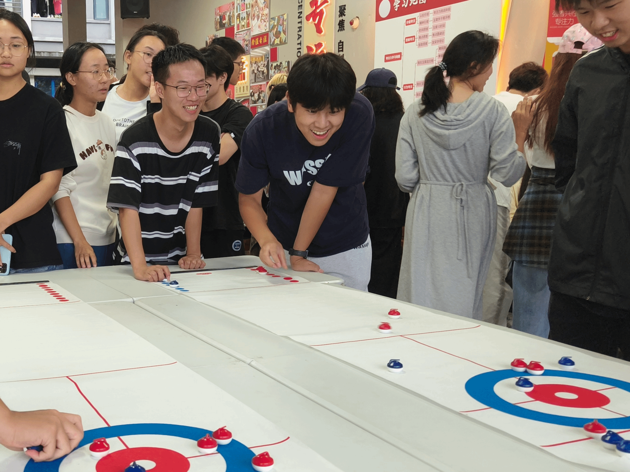 另一边的骗子酒馆和冰壶运动,骗子酒馆和冰壶作为现在最流行的桌上游戏,受到了同学们的积极参与,看着同学们第一次即使输掉比赛,却依然把开心挂在脸上,不可否认这是朋友之间增加友谊的绝佳方式。桌游区的“骗子酒馆”里,欢呼声与惊叹声此起彼伏。同学们时而化身逻辑缜密的推理者,时而切换为滴水不漏的“戏精”,每一次翻牌都让人心脏悬起,每一次成功“蒙混过关”,又能收获满溢的“脱险”快感。桌面冰壶,则是一场浓缩的室内欢乐聚会。当最后一壶落定,比分已不再重要,留在心中的是那份与朋友们共同思考、呐喊、欢笑的温暖记忆。这方寸之间的冰壶赛道,无疑是连接彼此、释放压力的绝佳舞台。