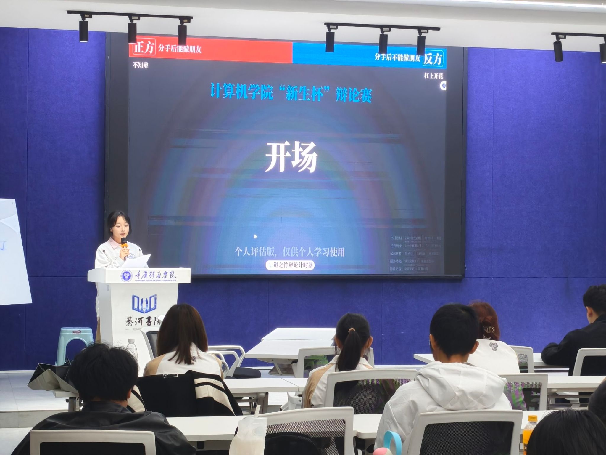 2025年10月25日晚,綦河书院观涛多功能报告厅内灯火通明,气氛热烈。计算机学院“新生杯”辩论赛决赛于傍晚六点正式拉开帷幕,热烈的掌声标志着这场备受瞩目的思辨盛宴顺利启航。本次决赛共吸引三支强队参与角逐,分别为不知辩队、杠上开花队与嘴炮游击队,围绕三个紧扣现实与情感的辩题展开思辨较量,展现了新生辩手的逻辑风采与语言魅力。
