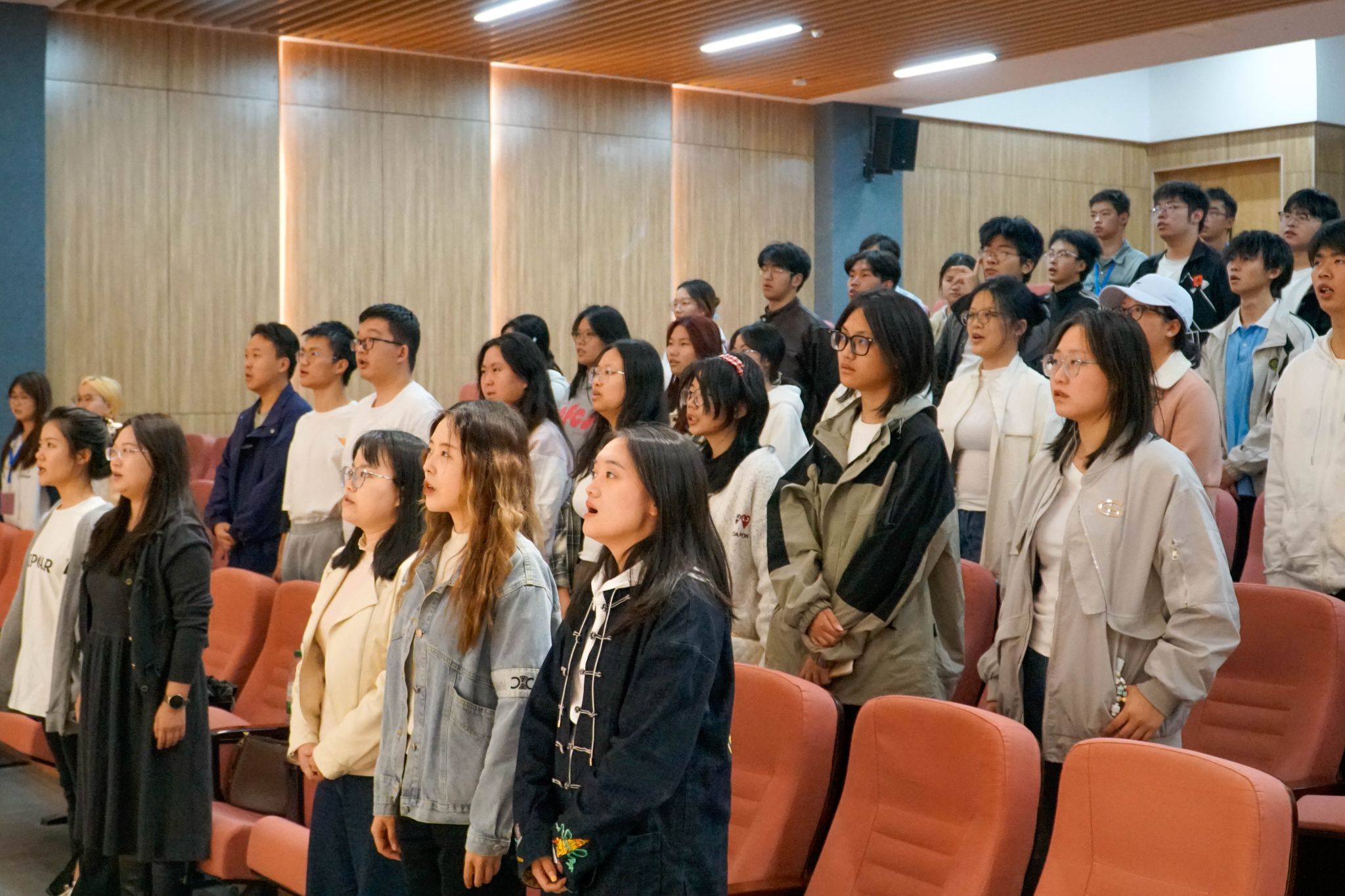 仪式开场,全体学员精神饱满、齐声高唱《光荣啊,中国共青团》。“我们是五月的花海,用青春拥抱时代;我们是初升的太阳,用生命点燃未来……”激昂澎湃的歌声在会场内久久回荡,每一个音符都饱含着学员们对共青团的崇高敬意,以及对肩负青春使命的坚定担当。在这激昂的团歌声中,学员们凝聚起了奋进新征程的青春力量。