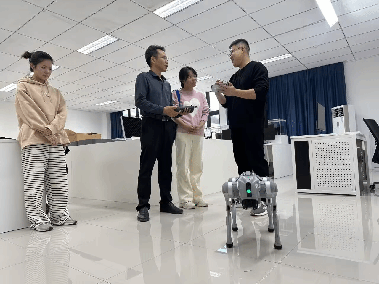 活动中,卢星儒主任向来宾集中展示了学院引进的智能服务机器人与四足机械狗。服务机器人搭载多传感器融合系统,支持编程路径设定,参观者通过自定义指令观察其自主避障与动态调整的执行过程,深入理解人工智能的决策逻辑。