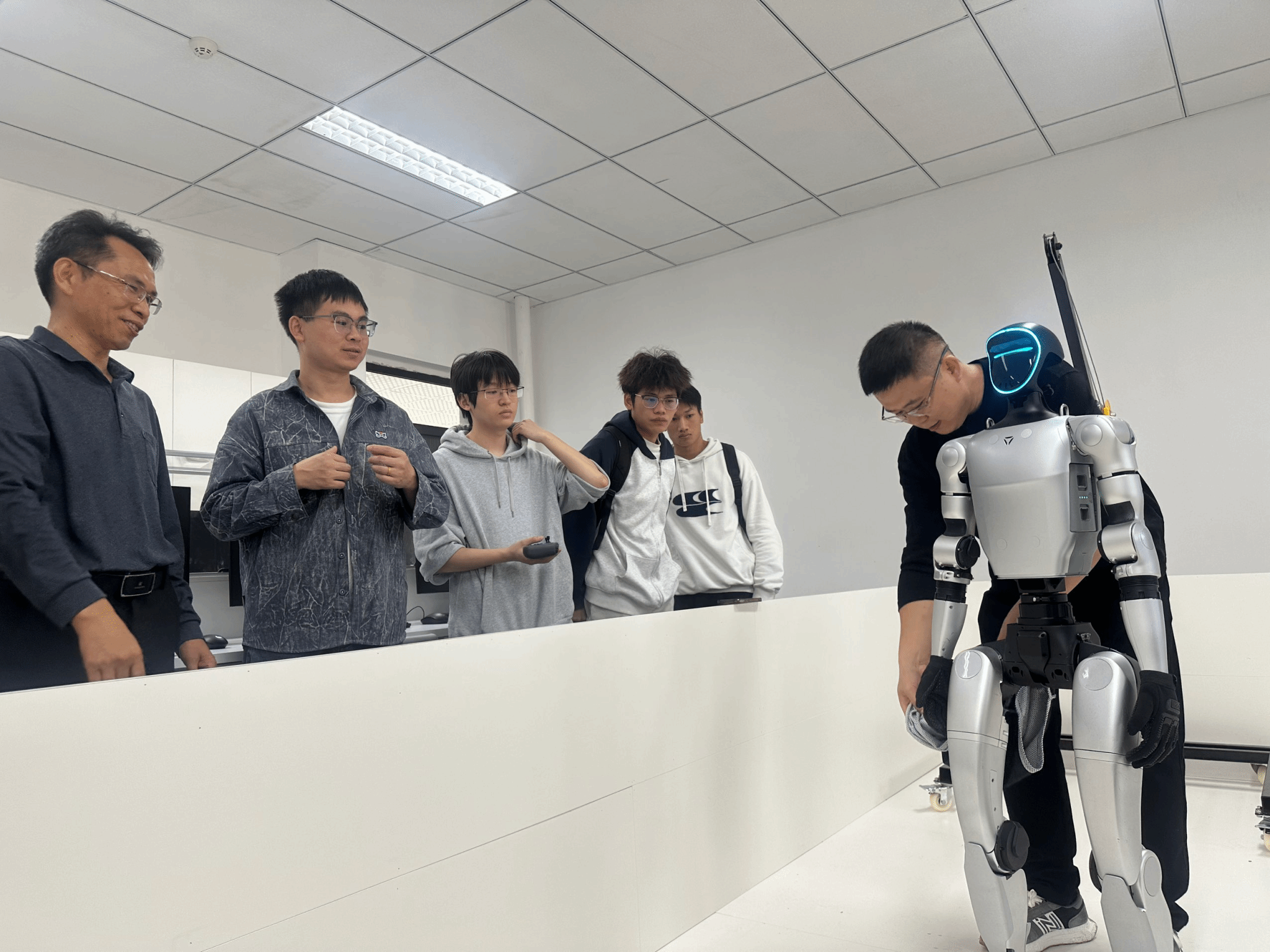 四足机械狗则凭借高精度惯性导航与3D视觉模块,现场完成高度跳跃、斜坡攀爬等自主动作,并在相应指令下实现"坐立""翻滚"等拟人化互动。綦江中学一行人通过手持终端实时调节机械狗的运动参数,直观感受其平衡算法对复杂地形的动态响应,设备展现出的环境适应能力赢得现场阵阵赞叹。