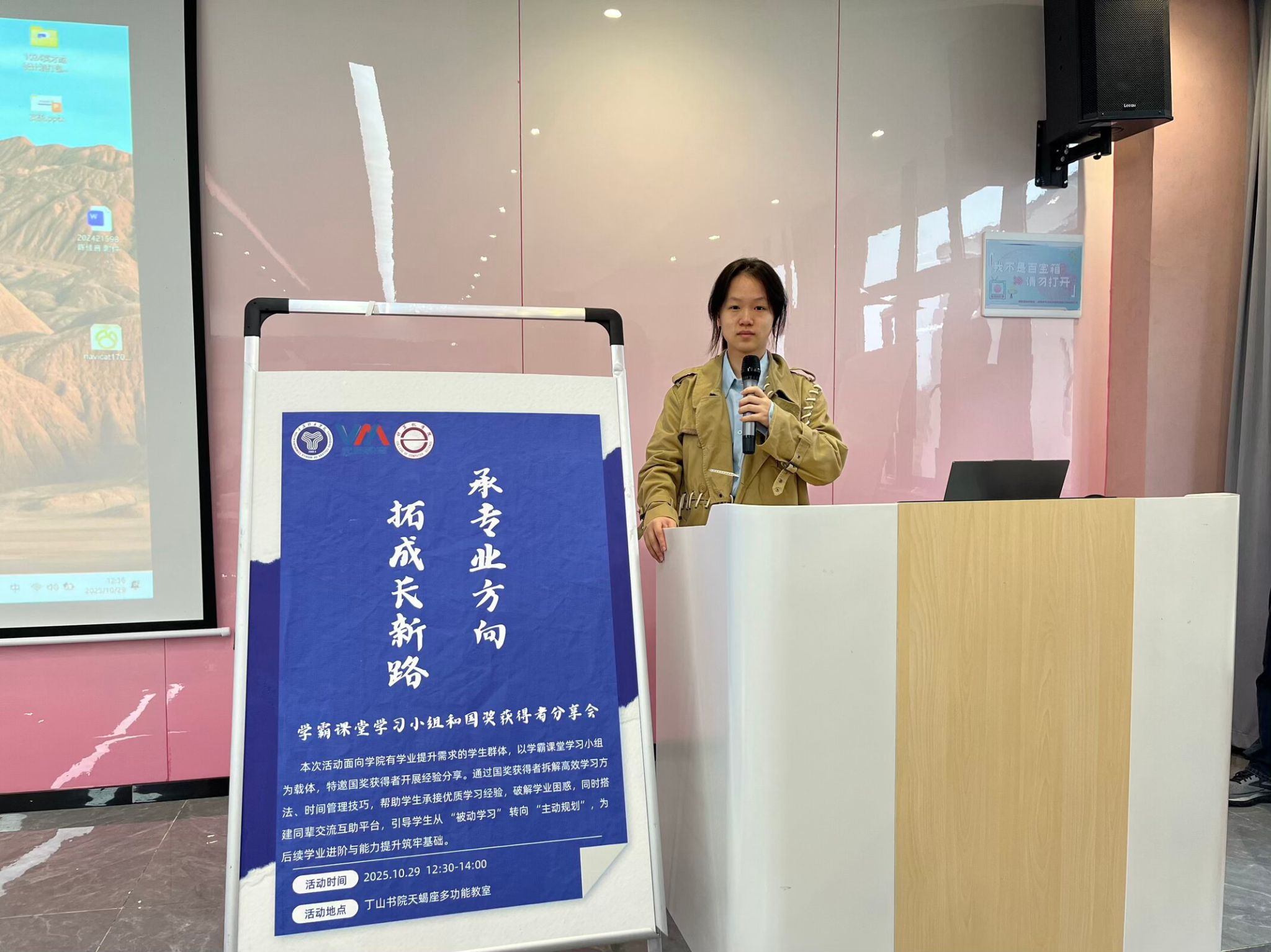 10月29日中午12:30,计算机学院在丁山书院天蝎座多功能教室举办了一场主题为“承专业方向,拓成长新路”的分享会。本次活动由计算机学院主办,学霸课堂学习小组和国奖获得者共同参与,吸引了众多渴望学业提升的同学前来聆听。