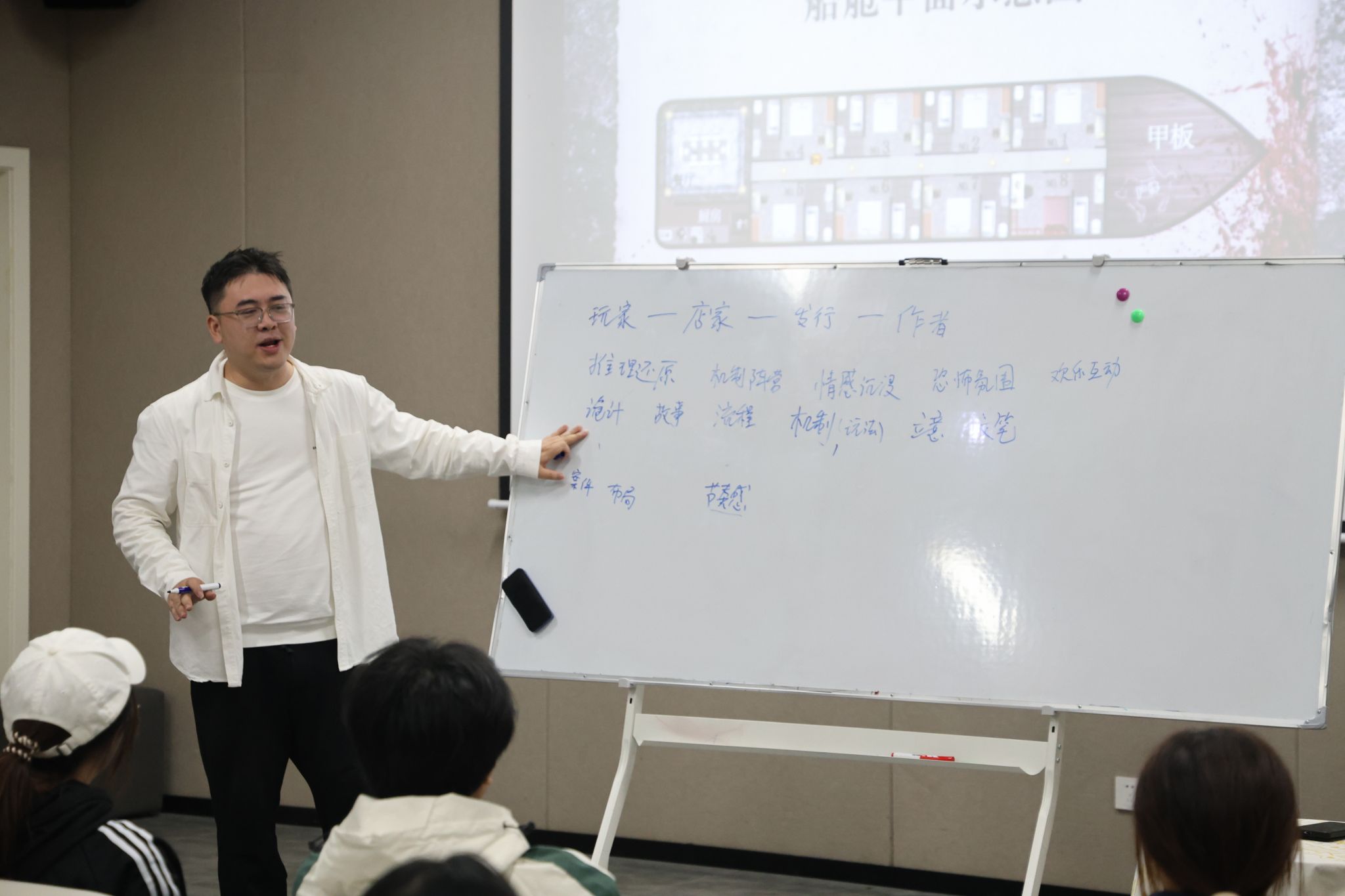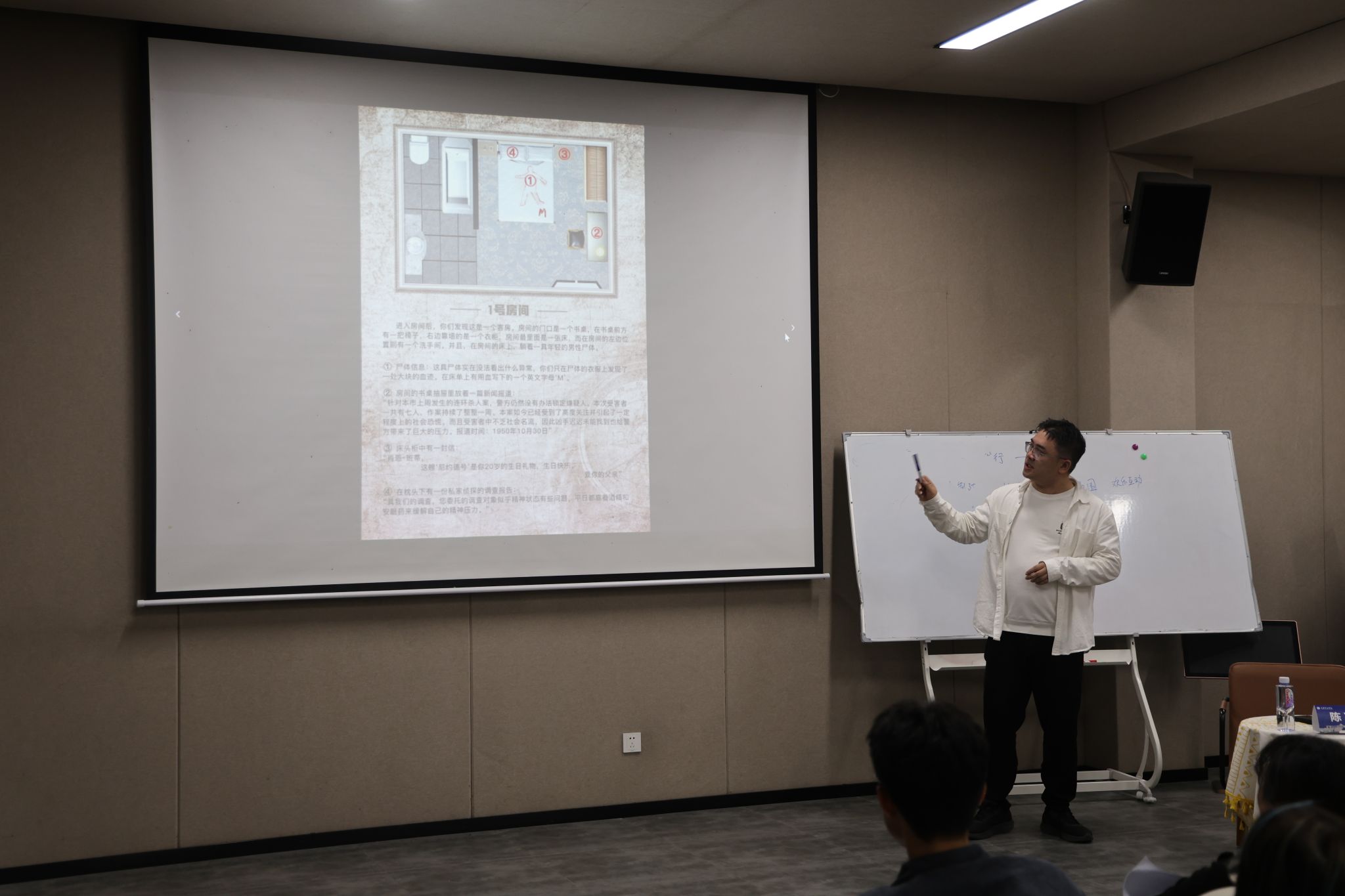 随后,讲座聚焦于“诡计”这一推理本的核心。陈凌霄老师以2018年发行的独家剧本《恐怖游轮》为例,将现场观众分为八个角色,从玩家视角出发梳理线索、探寻真相,进而切换至作者视角,解析如何在流程设计中掌握推理节奏,提升玩家体验。他提出,一个合格的“诡计”需具备逻辑严谨、节奏把控得当、线索布局合理等要素,前期不应吝啬线索,后期则需巧妙隐藏“出口”,通过情绪拉扯与情节反复增强玩家沉浸感。
