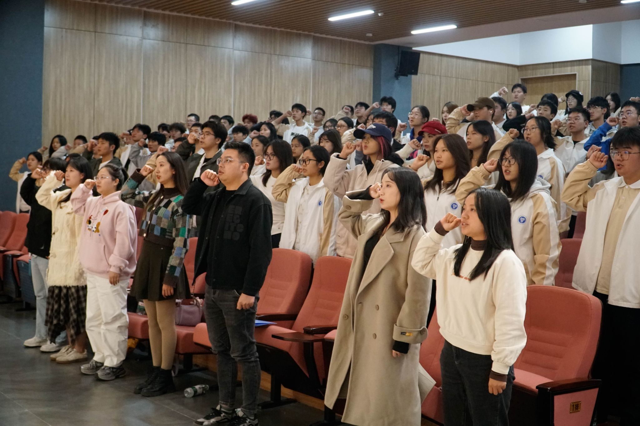 传承启航仪式在全场目光聚焦下,往期优秀学员代表陈凯涛、谢娅手持鲜红的青马班旗帜,郑重交予新学员代表。旗帜上的图案与文字,既是青马精神薪火相传的象征,更是新一代青年接过使命、接续奋斗的见证。授旗完毕后,全体学员起立,高举右拳,在领诵声中重温入团誓词:“我志愿加入中国共产主义青年团,坚决拥护中国共产党的领导……”铿锵有力的誓言不仅是对入团初心的回望,更彰显了青马学员践行使命的坚定决心。