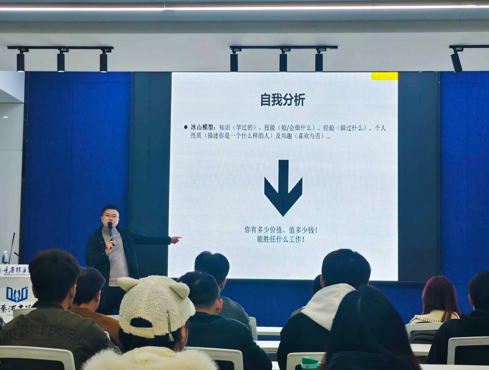 在自我分析环节,李璐老师引入“冰山模型”,启发同学们认识到简历优化不仅在于形式,更需基于清晰的自我认知与职业定位。他建议同学们结合自身优势与目标岗位,精准投递,避免资源浪费与自我低估,从而实现简历价值的最大化,助力匹配更合适的职业机会。