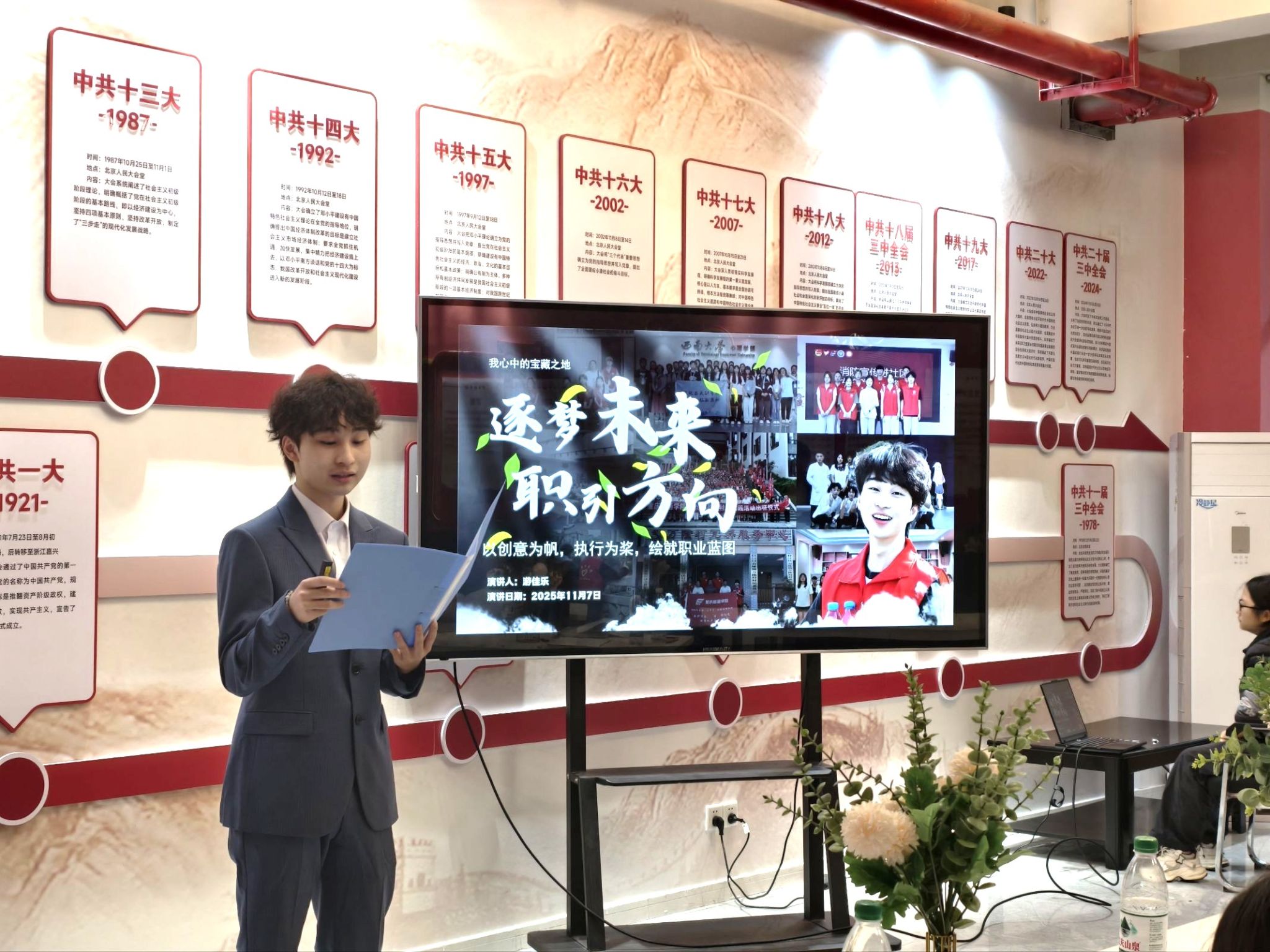 为引导学生树立科学的成才观与就业观,提升综合素质与职业规划能力,推动实现更高质量就业,计算机学院于2025年11月7日在綦河书院·党团活动室成功举办职业规划大赛院级选拔赛。本次比赛特邀白洪雨、邹健、李佳、郑伟四位校内导师担任评委,设置成长与就业双赛道。经过前期筛选,共有15名选手进入最终角逐。