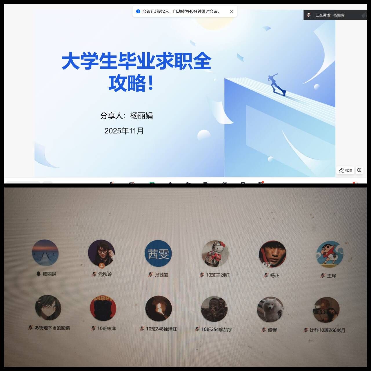 为帮助大四学子筑牢求职权益意识、规避就业风险,2025年11月13日,异科导师杨丽娟以线上会议的形式,给大四异科学生开展“大学生毕业求职全攻略”主题分享会。本次分享聚焦求职关键权益点,结合真实案例深度解析,班级部分学生在线参与。