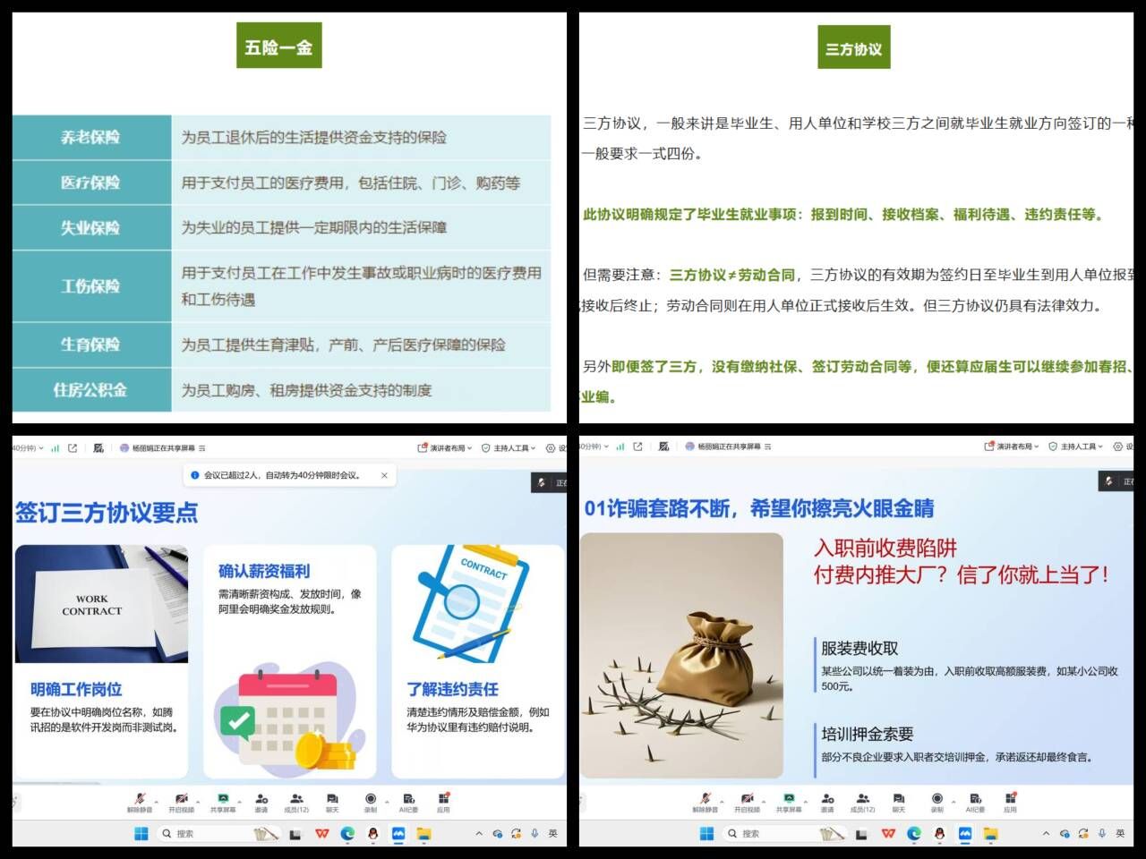 会上,杨老师紧扣毕业生求职过程中最关注的核心问题,从基础保障、协议规范、合同签订、风险规避四个方面进行了分享。针对“五险一金”这一基础保障内容,教师通过对比“五险”强制缴纳与“一金”政策规定、拆解缴费比例与享受待遇等关键信息,结合不同行业缴费案例,让学生清晰掌握自身合法权益。