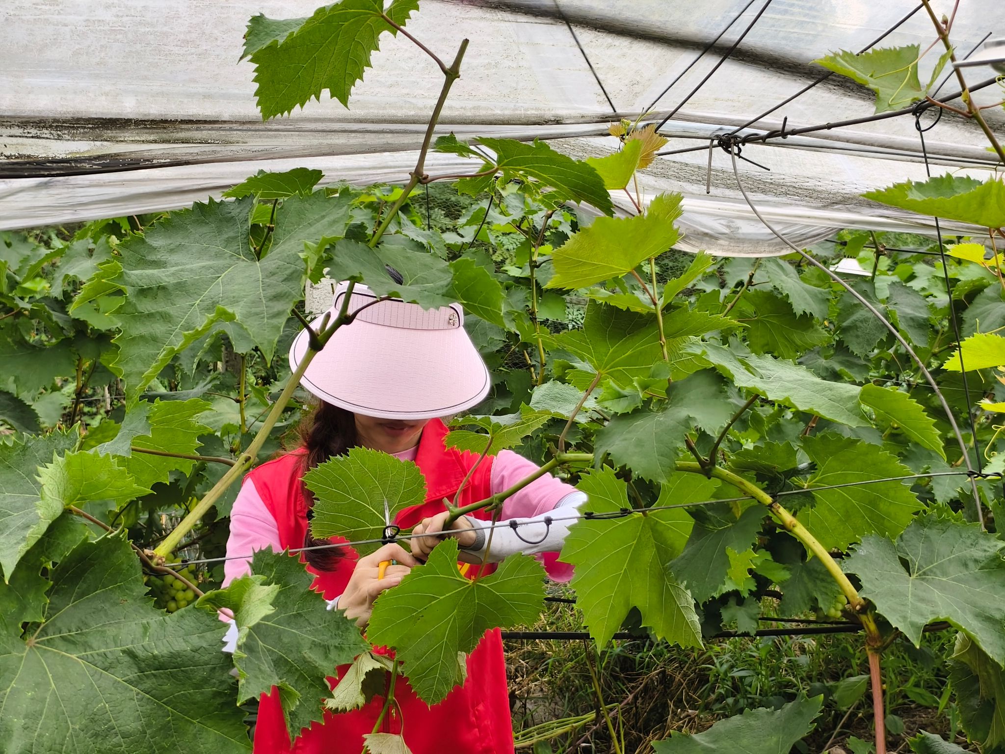 团队抵达花坝村李葡桃果园后,果园负责人带领创研社团队成员们前往葡萄棚中进行葡萄藤蔓的修枝修剪。成员们满怀激情地踏上这段实践之旅,李先生满怀热情的为成员们讲解在修剪藤蔓时的注意事项,例如为什么需要保留适当叶片在果枝上,因为适当的枝叶有利于葡萄果实的生长,可以收获更加香甜可口的果实。为成员们统一做完示范修枝后还走到每位志愿者的身旁,耐心为成员们进行一对一指导。创研社团队成员们在实践中不仅学习到了如何修剪葡萄藤的枝叶等专业农业知识,同时也通过参与劳动实践收获了感悟与成长。