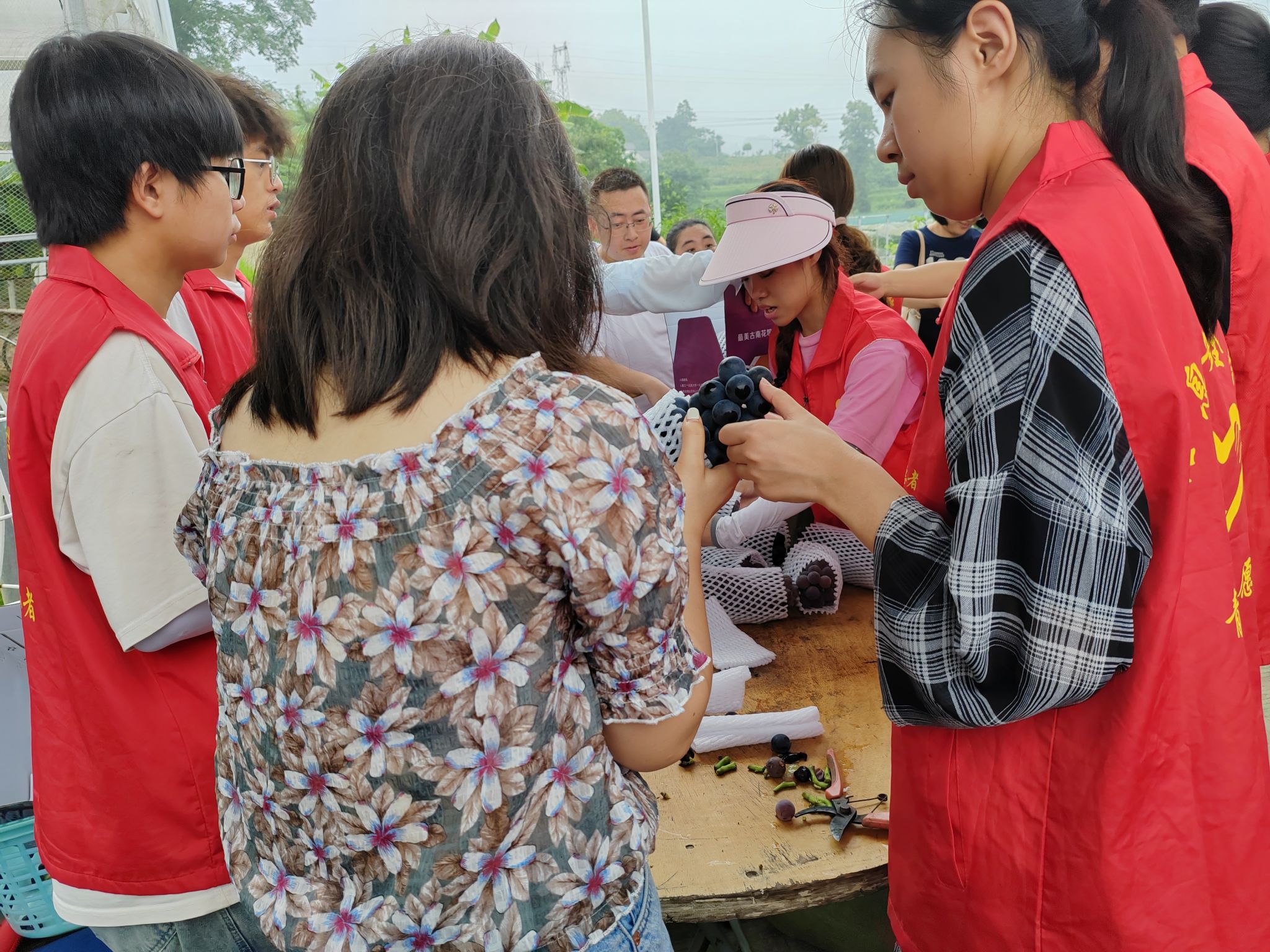 随后,一些游客们慕名而来,纷纷拿上葡萄篓和小剪子,在经过果园负责人简单的介绍过后,游客们便迫不及待地进入葡萄园,开始采摘藤蔓上晶莹剔透的果实,创研社乡村振兴促进团成员们热情帮助游客们进行采摘。当采摘完成后,志愿者们协助果园工作人员进行葡萄采摘后的修剪和打包。成员们将葡萄的枝丫修剪干净、给葡萄套上泡沫袋进行保护,防止运输受损,确保游客们的葡萄不易受到损坏。看着游客们脸上洋溢着幸福的笑容,成员们也深深感受到这难忘的劳动时光。