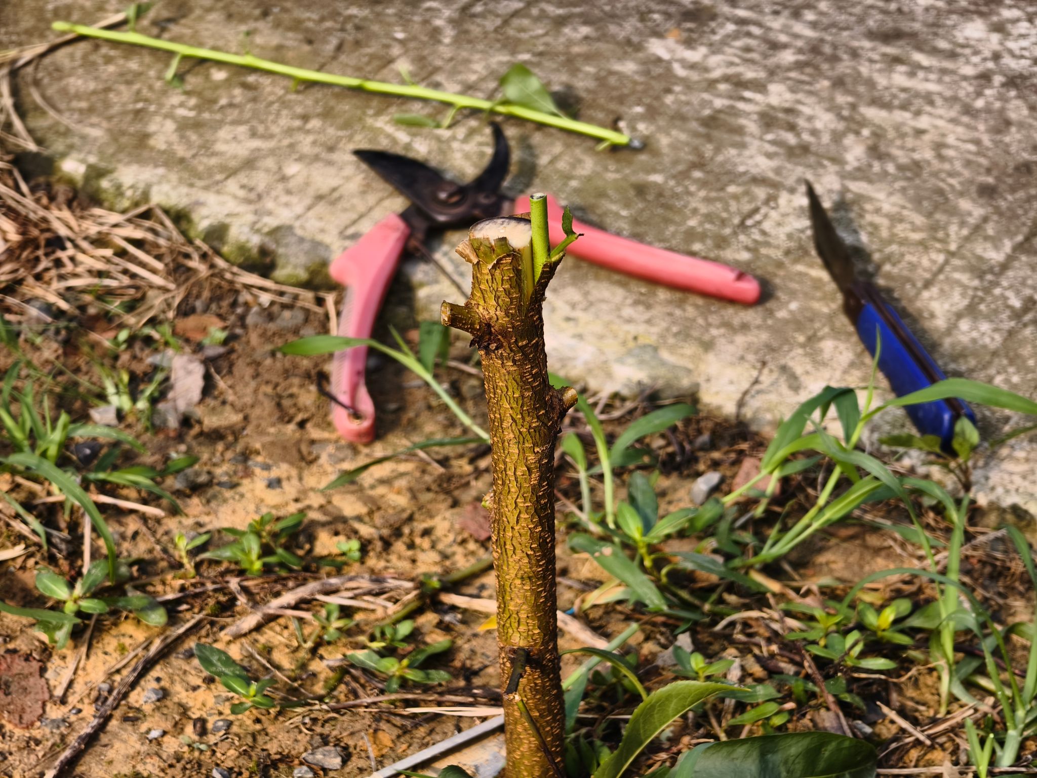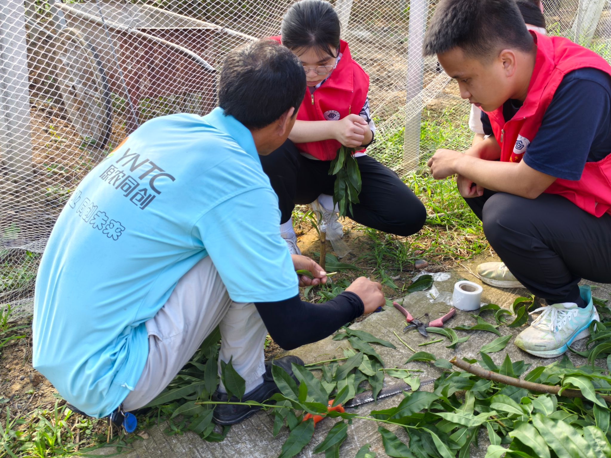 队员们便按照操作步骤,小心翼翼的对树押进行削皮,捆绑,轮流尝试果树的嫁接。在成员们不懈努力下,最终圆满完成对十余枝树丫的处理,同时也获得了李远孝先生的高度赞扬。通过具体的实践活动,队员们不仅掌握了切接法的技巧,更在实践中加深了农业的理解。