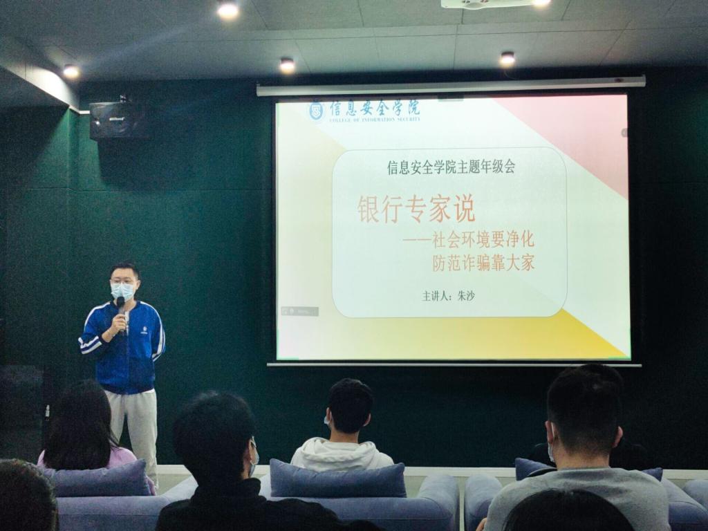 世界正处于信息化时代,我们的生活与网络早已密不可分,信息化极大的方便了我们的生活,但也为不法分子进行诈骗提供了便利,面对刚刚步入大学、防范意识还不强的我们便成了不法分子的主要目标。这便导致了大学“校园贷”等网络诈骗的诞生。为加强同学们的防诈骗意识,让同学们与校园贷说“不”,信息安全学院于2022年3月25日在綦河书院2号楼星云·影音室及其他会场举行了“银行专家说——社会环境要净化,防范诈骗靠大家”主题年级会。