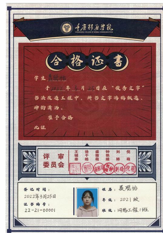经评审,第一期“俊秀文字”书法活动评选出聂聪怡、白珊珊、钟佳宏、刘娥、宋至真五位书法优秀的同学,随即评审委员会向五位同学颁发了盖有委员会成员印章的合格证书。