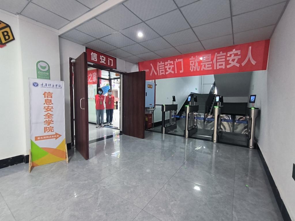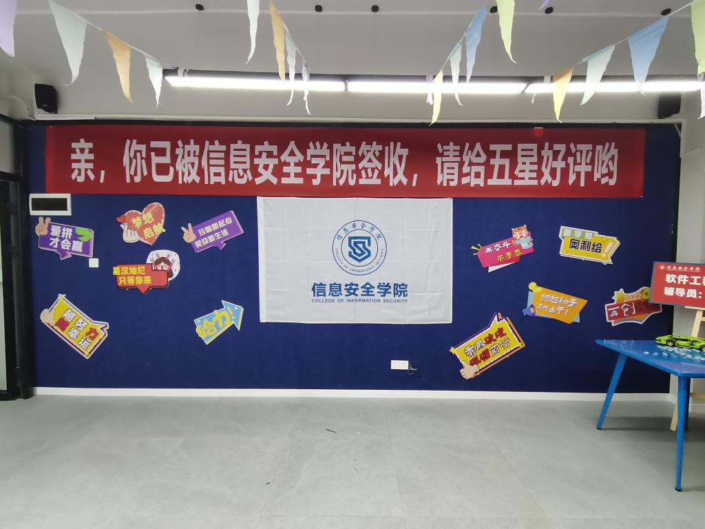 信息安全学院全体辅导员,历经20余天,全员上阵设计布置,在晨钟展厅共同打造了信安新生报到处,翘首以盼萌新“驾临”,终于在2022年9月14日14:14迎来了信息安全学院2022级的第一位正式报到的新生——22级软件工程2班 易帆,高大的男生带着丝丝喜悦与好奇,载着理想与憧憬,他,来到了信安。