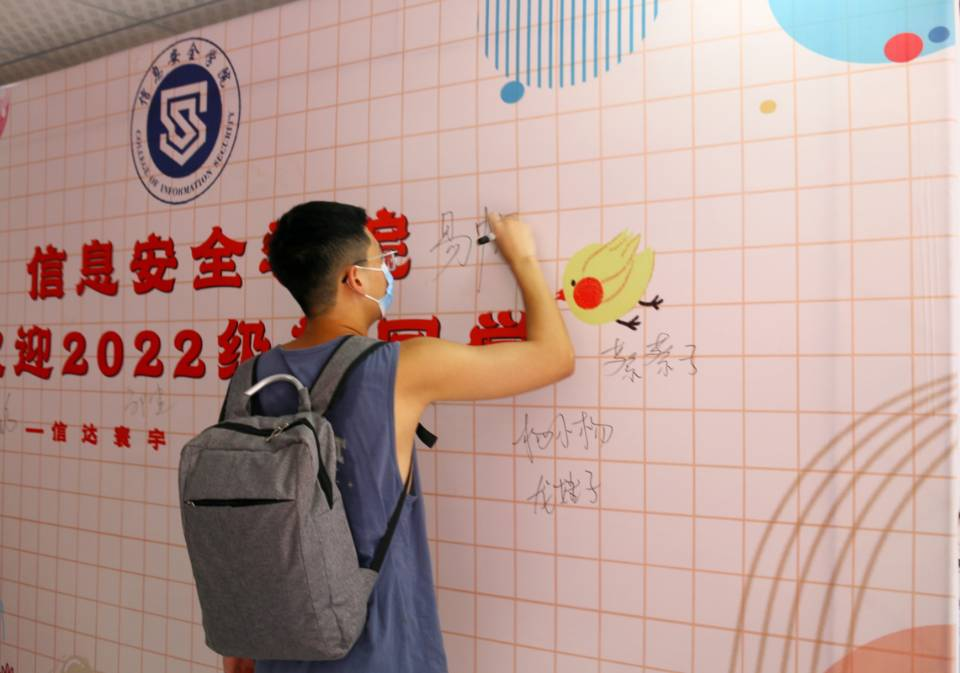 易帆同学是重庆开州人,选择在本地上学,青涩的模样怀揣着一颗追求梦想的心,踏入了重庆移通学院信息安全学院的大门,这个可以带给他知识和成长的地方。他是第一个报道的新生,在一众志愿者的簇拥下走到新生报道墙前写下了自己的名字名字,这一笔落下,信息安全学院22级新生正式登上大学舞台。