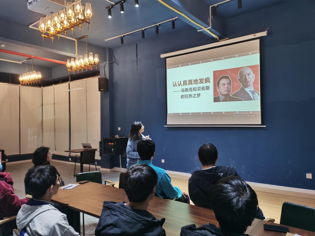 “你们有听说过特斯拉和亚马逊这两家公司吗?”庞老师问在场的各位同学。大多数同学表示有所耳闻,但对其背后的两位主理人却不甚了解。马斯克和贝佐斯可以被看作近年来最为成功的商人,而他们在太空领域开启的竞争也不断促进人类航空事业的发展。走进他们,了解他们,也是认识自己的一种方式。