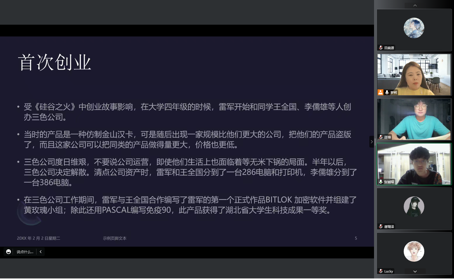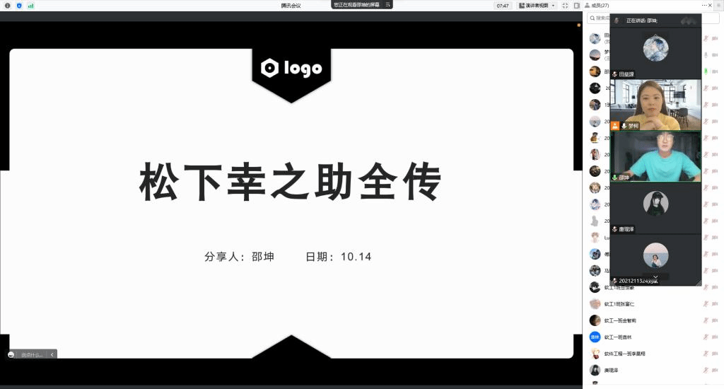 又到了一年深秋,空气中弥漫着冰冷的空气,但书籍的温情却能够温暖彼此,正所谓读万卷书,行万里路,知识就是力量,知识就是人生的伴侣,虽然最近疫情形势严峻,疫情防控更加的严格,在严格遵守防控办的要求下,我们将线下分享形式换为线上,让大家从书籍中获得力量。2022年10月14日全生异科导师边梦柯组织2021级软件工程1班的33位同学在线上会议召开第六次大咖书籍分享会,会议在邵坤的主持下展开,分别由邵坤、翁林、张铖琛三位同学为我们带来三个不一样的大咖人物。